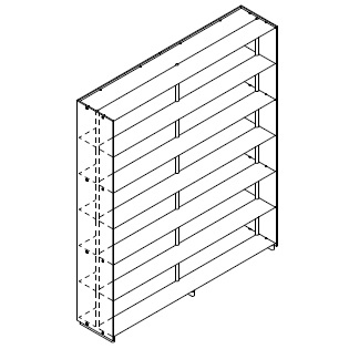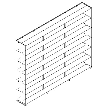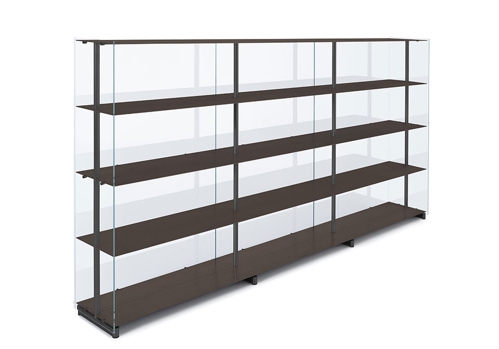 Red Baron conçue par Piero Lissoni pour Knoll est une bibliothèque modulaire avec une structure en aluminium peint en anthracite ; le dos et les côtés sont en verre trempé. Les étagères sont des pièces uniques de deux ou trois mètres en aluminium extrudé. Les extrémités des pieds sont équipées de pieds en acier pour le réglage en hauteur.