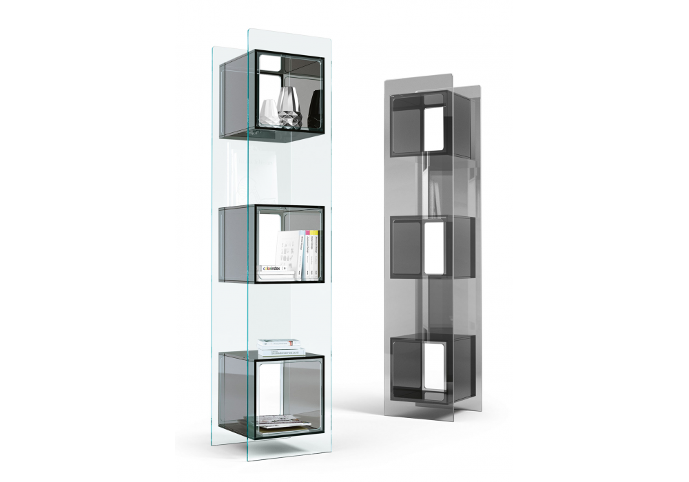 Magique Totem conçu par Studio Klass pour Fiam est un meuble d'exposition avec des cubes de rangement en verre soudé fabriqués en différentes finitions. Structure en verre extralight ou fumé.