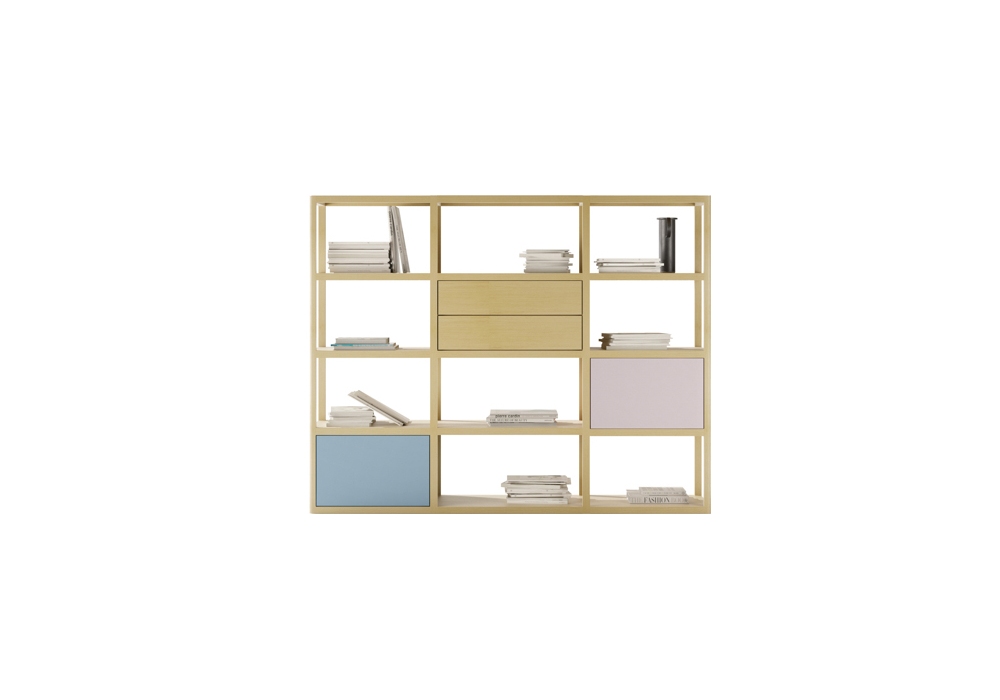 Kai conçu par Iratzoki Lizaso pour Treku est une bibliothèque modulaire en bois disponible en différentes finitions en bois, avec certaines parties fermées par des portes en bois dans les finitions disponibles.
