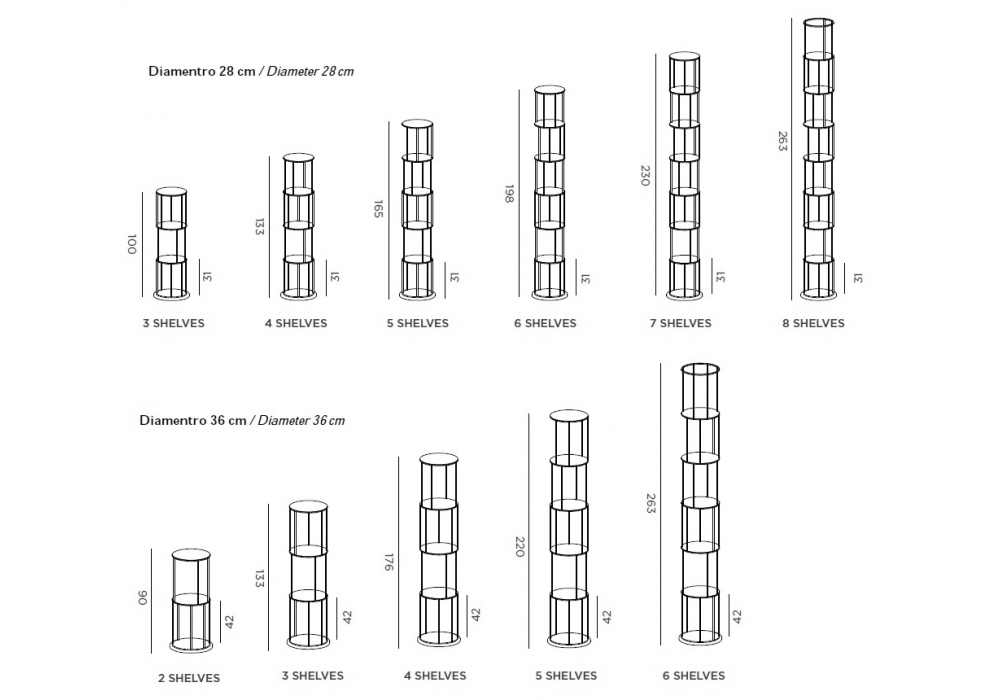| Dimensions | • Ø 28 x H 100 cm; • Ø 28 x H 133 cm; • Ø 28 x H 165 cm; • Ø 28 x H 198 cm; • Ø 28 x H 230 cm; • Ø 28 x H 263 cm; • Ø 36 x H 90 cm; • Ø 36 x H 133 cm; • Ø 36 x H 176 cm; • Ø 36 x H 220 cm; • Ø 36 x H 263 cm |