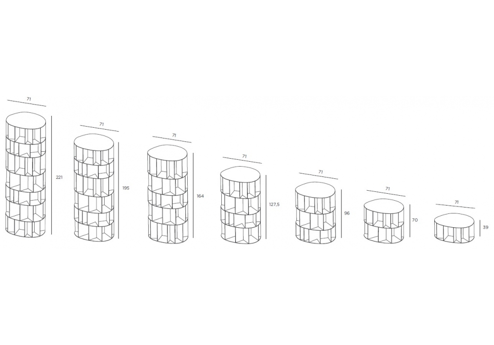 | Dimensions | Ø 71 x H 39 cm; Ø 71 x H 70 cm; Ø 71 x H 96 cm; Ø 71 x H 127.5 cm; Ø 71 x H 164 cm; Ø 71 x H 195 cm; Ø 71 x H 221 cm |