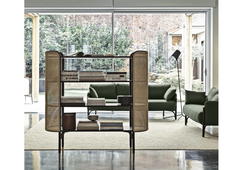 Mos conçue par GamFratesi pour Gebrüder Thonet Vienna est une bibliothèque avec structure en hêtre cintré et inserts en paille de Vienne. Étagères en plaqué frêne teinté à pores ouverts. Pieds en laiton.