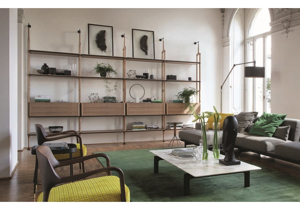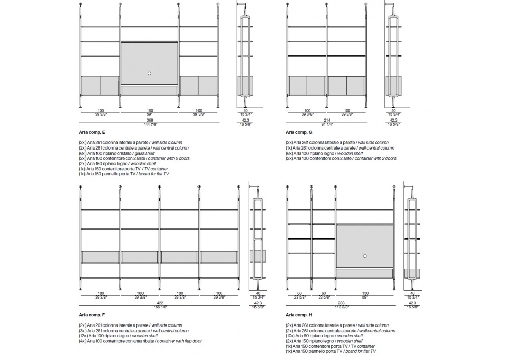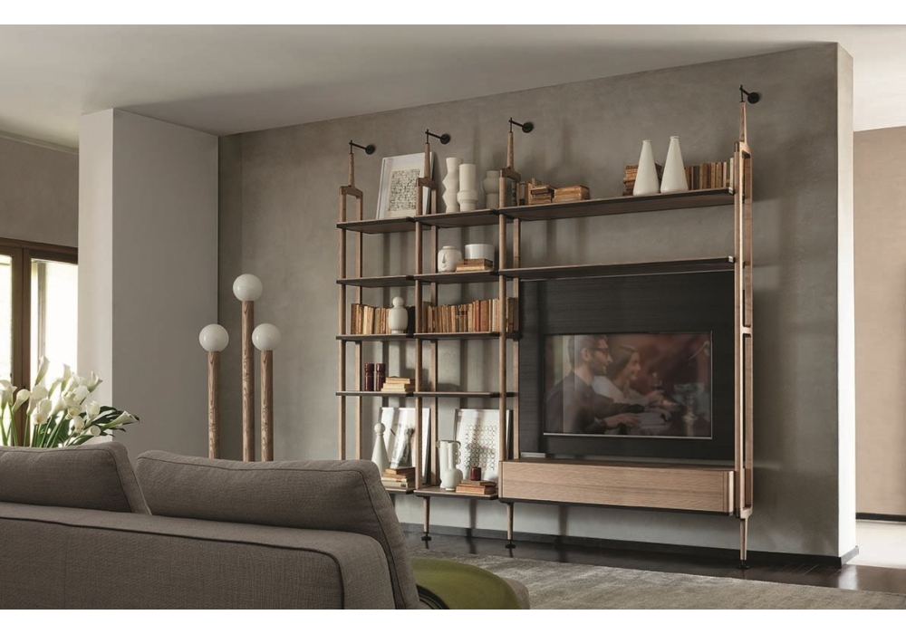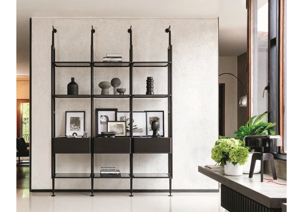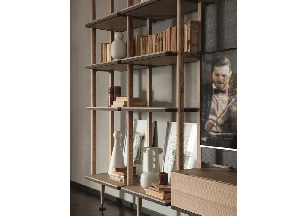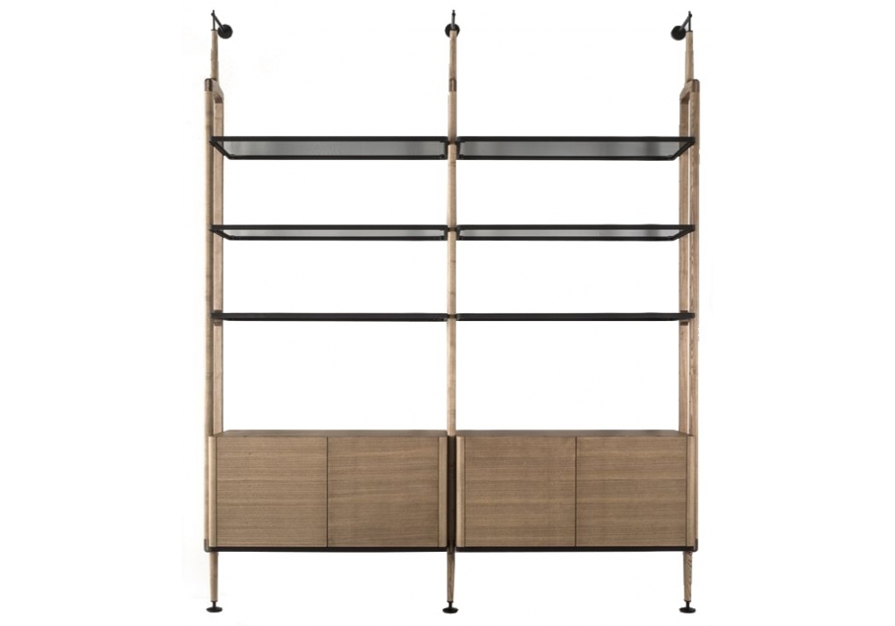 Aria conçue par D. Dolcini pour Porada est une bibliothèque modulable avec des colonnes portantes en frêne et se fixant au plafond ou au mur. Il est possible de personnaliser la composition à travers des étagères en frêne ou en verre fumé, une commode et des récipients en frêne soutenus par une armature en métal noir mat. Pour d'autres compositions, contactez le service client.