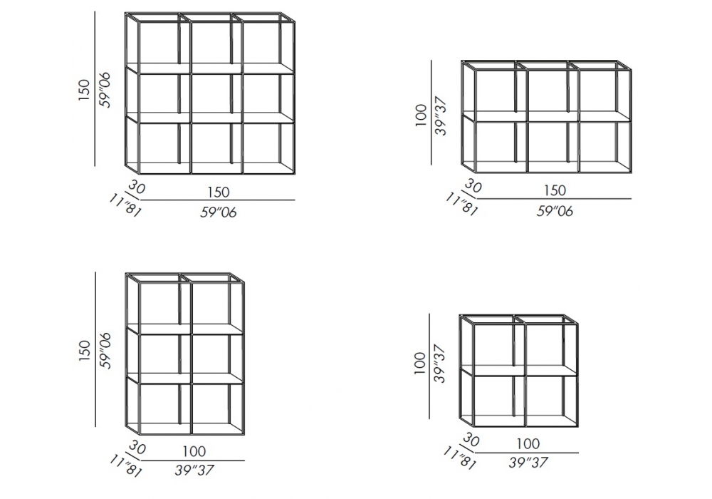 | Dimensions | 150 x 30 x H 150 cm; 150 x 30 x H 100 cm; 100 x 30 x H 150 cm; 100 x 30 x H 100 cm. |