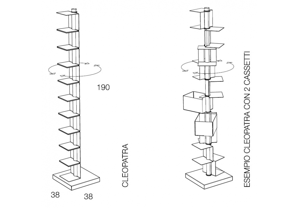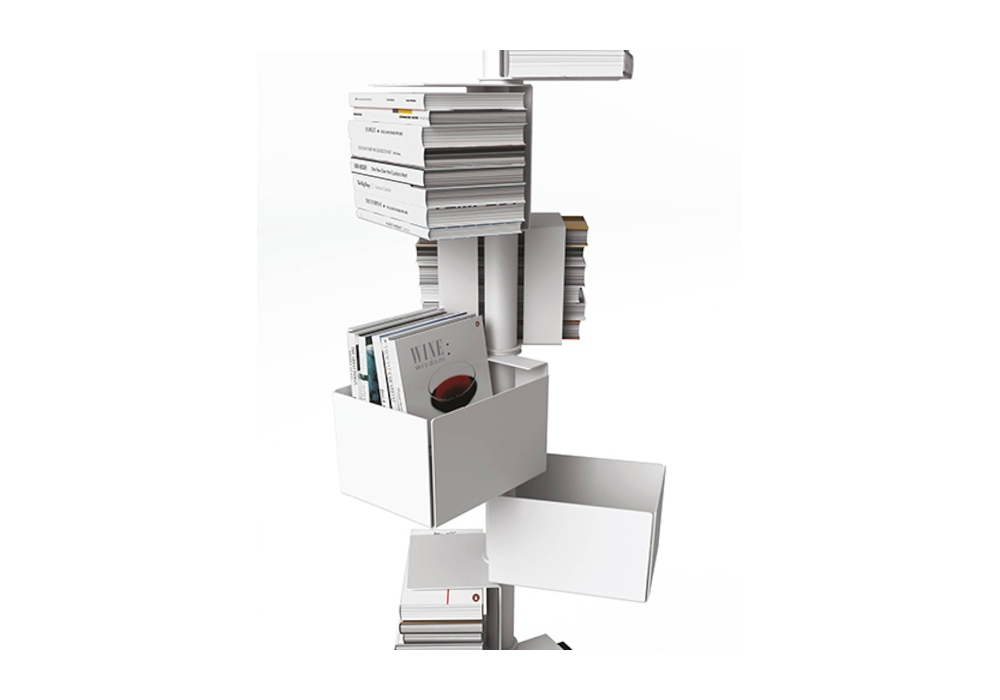 Cleopatra conçue par DSH pour Minotti Italia est une bibliothèque verticale autoportante dotée de dix étagères métalliques tournant autour de la structure, peintes avec des poudres thermodurcissables en blanc mat, base en acier inoxydable. Possibilité d'ajouter un kit composé de deux tiroirs.