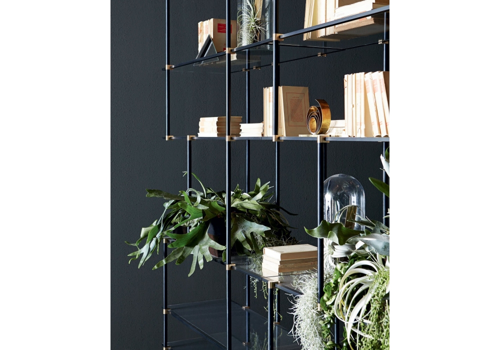 Drizzle conçue par Luca Nichetto pour Gallotti&Radice est une bibliothèque modulaire avec structure en aluminium anodisé et supports d’étagères en laiton satiné. Tablettes en verre extralight trempé épaisseur 10mm. Disponible aussi en verre “grigio Italia” fumé.