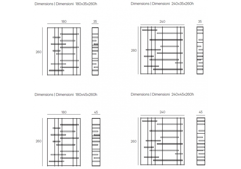 | Dimensions | 180 x 35 x H 260 cm; 180 x 45 x H 260 cm; 240 x 35 x H 260 cm; 240 x 45 x H 260 cm. |