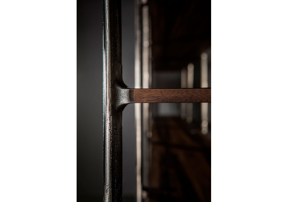 Web conçue par Massimo Castagna pour Henge est une bibliothèque composée de montants structurels en Peltro coulé au sable et d'étagères en placage de bois massif. Disponible en différentes finitions et dimensions.