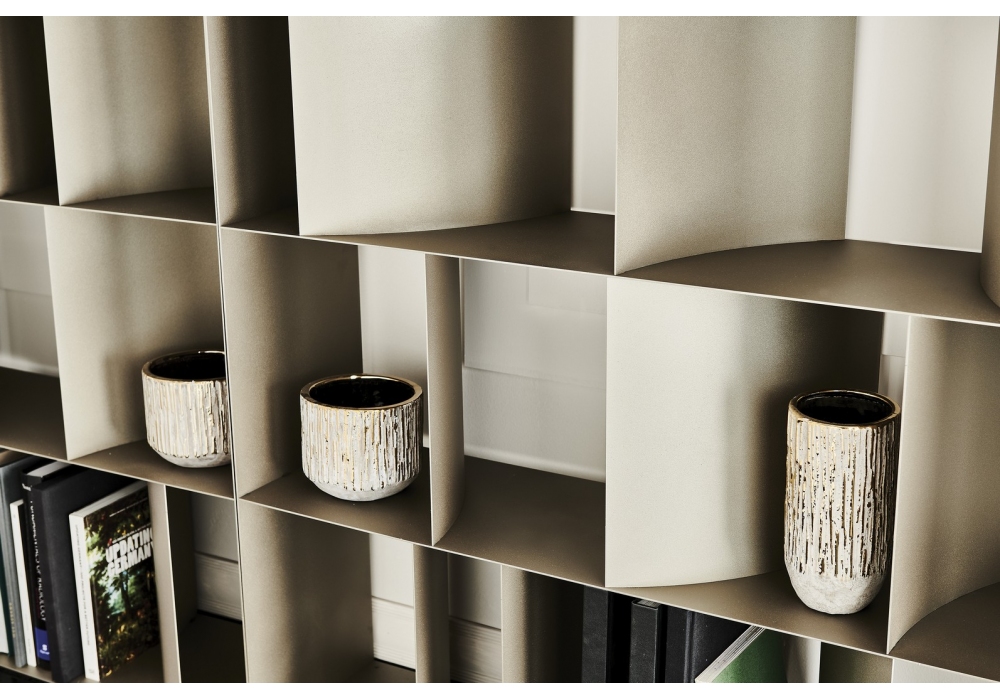 Nautilus conçue par Brogliato Traverso pour Cattelan Italia est une bibliothèque avec structure en acier laqué gaufré dans les couleurs suivantes : noir, titane, bronze et graphite.
