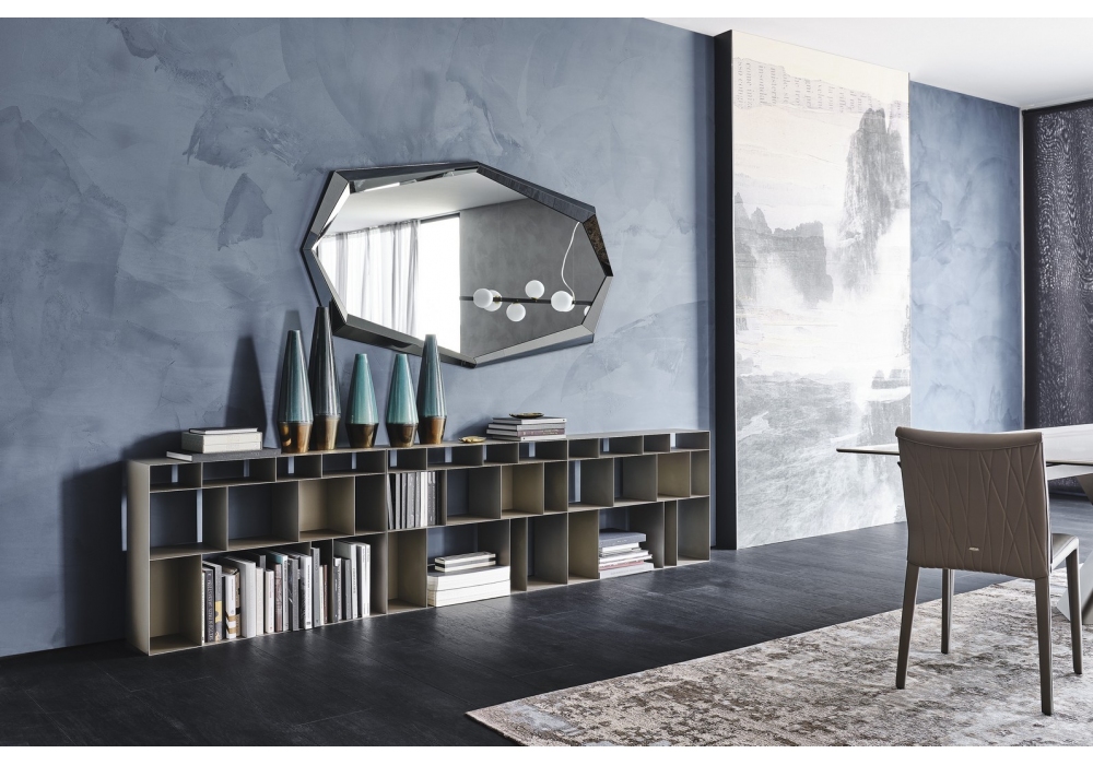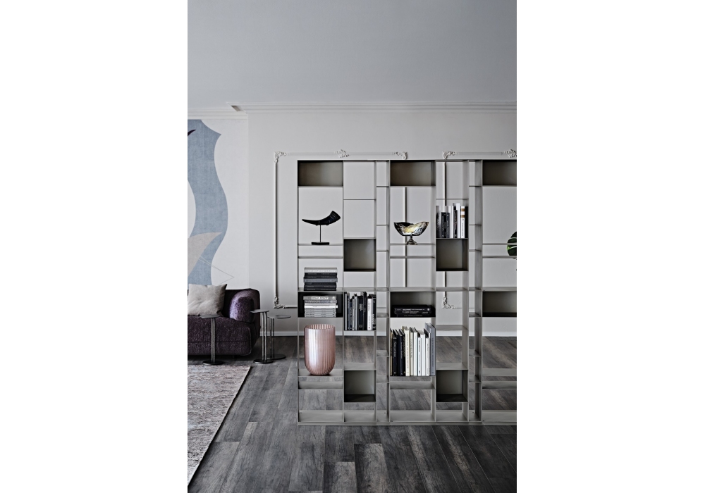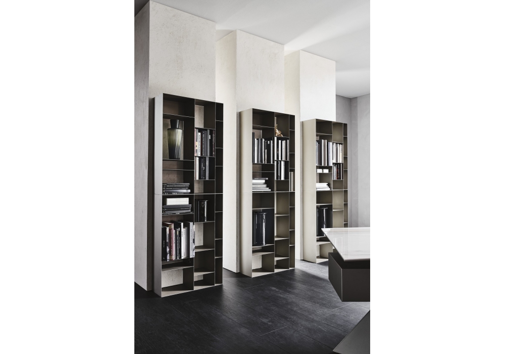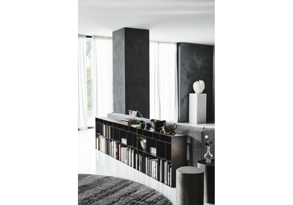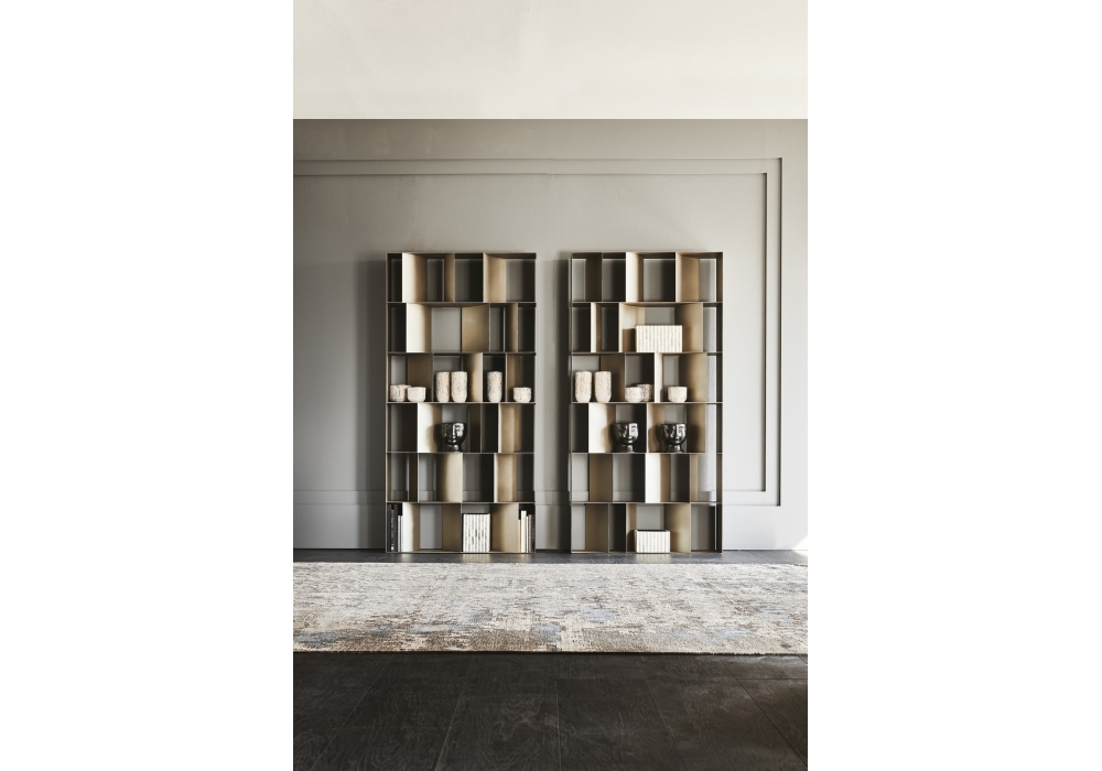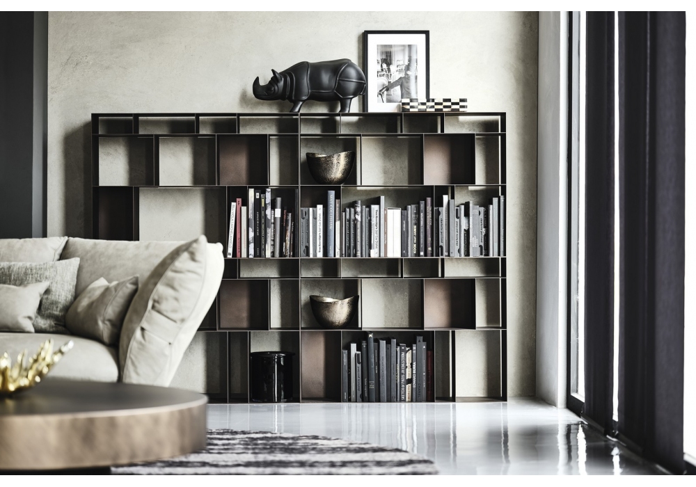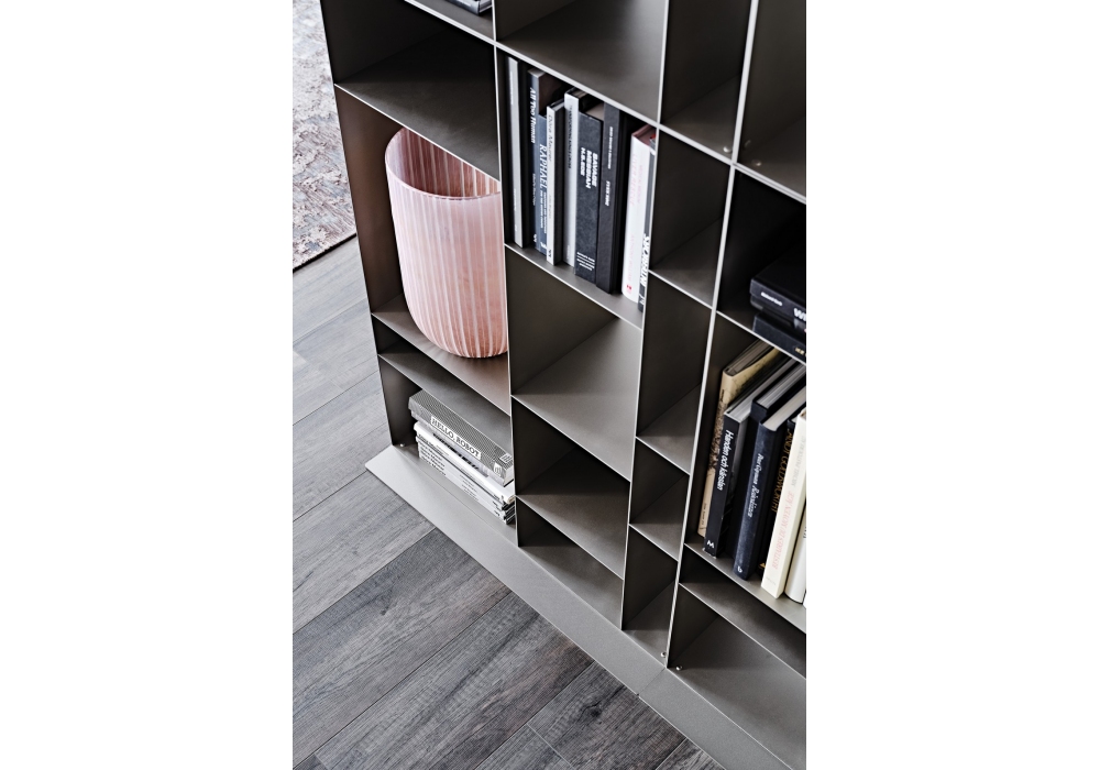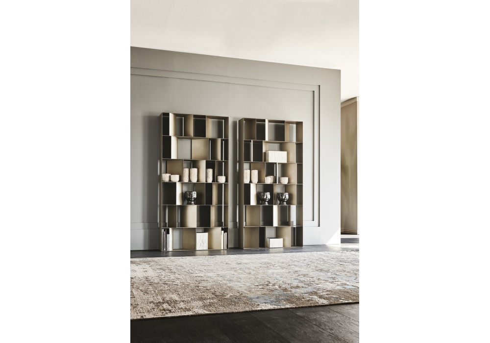 Latitude conçue par Ono Design pour Cattelan Italia est une bibliothèque modulable avec structure en acier laqué gaufré de couleur titane ou bronze.