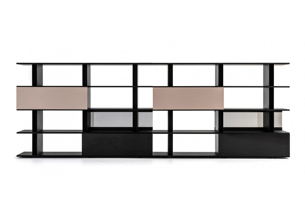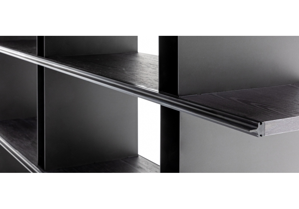Frame-Shift conçue par Gabriele et Oscar Buratti pour Moroso est une bibliothèque modulable composée d'étagères en MDF avec placage Alpi, avec des guides pour portes coulissantes en aluminium extrudé anodisé noir. Montants en tôle d'acier laqué noir mat. Portes en MDF laqué, mat ou brillant, ou en verre trempé Stopsol. Patins réglables en polypropylène noir.