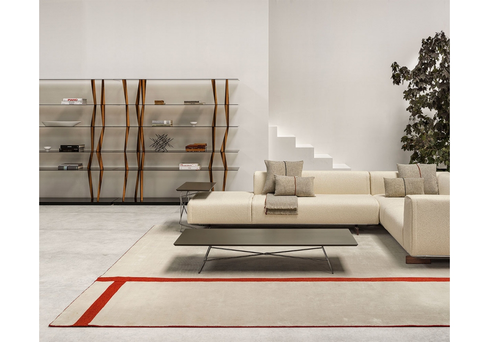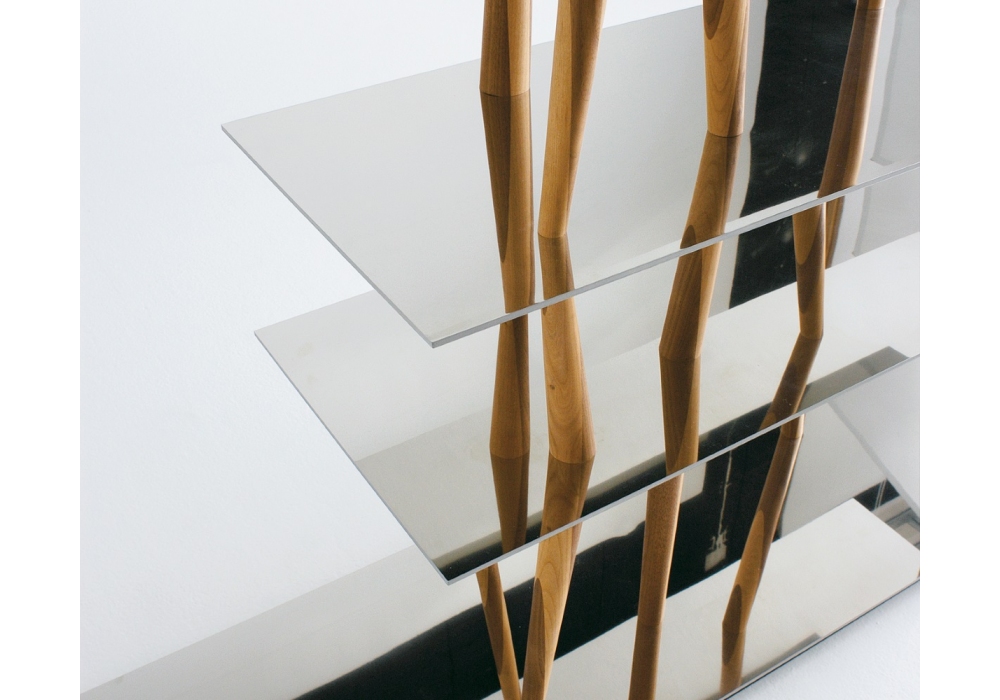 Sendai conçue par Toyo Ito pour Casamania & Horm est une bibliothèque en bois d'aulne massif et noyer canaletto traité à l'huile et étagères en MDF plaquées en aluminium poli. Disponible en différents modèles.