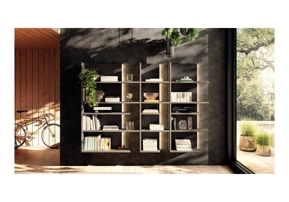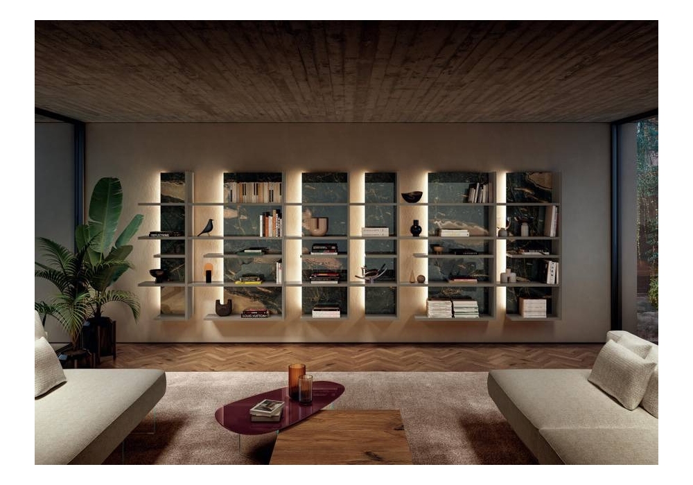 Pentagram conçue par Daniele Lago est une bibliothèque avec des étagères laquées et un dossier en XGlass ou en verre laqué. Il est disponible en deux versions : au sol ou murale. Le modèle au sol de la bibliothèque Pentagram peut inclure des rangements pratiques avec l'ouverture de la porte à abattant, pour créer un espace de bureau à utiliser comme bureau à domicile.