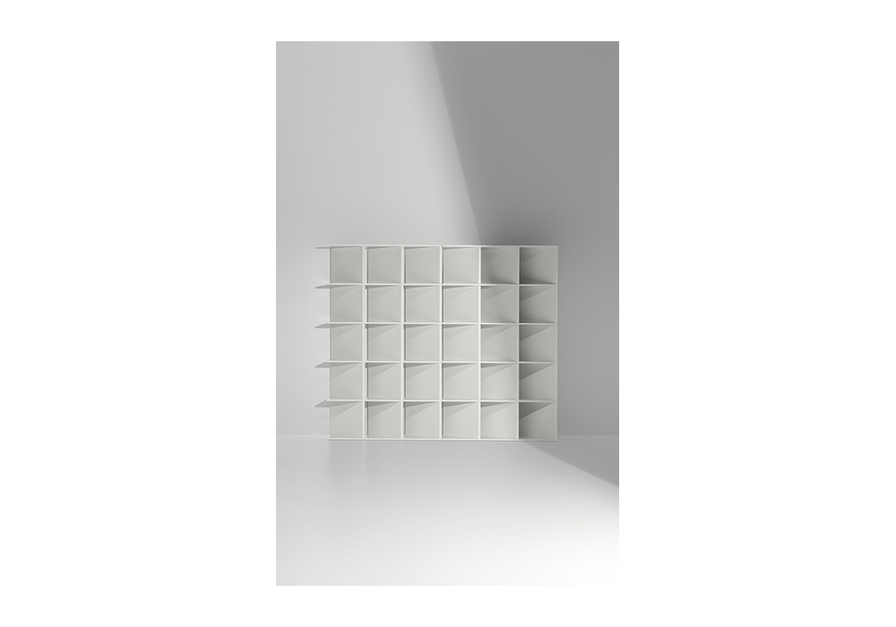 Illusion conçue par Spazioameno pour Bonaldo est une bibliothèque avec structure en bois laqué mat, disponible en différentes finitions.