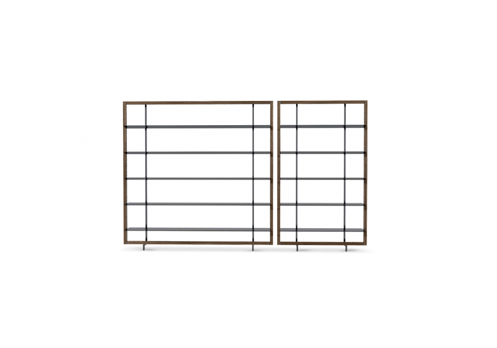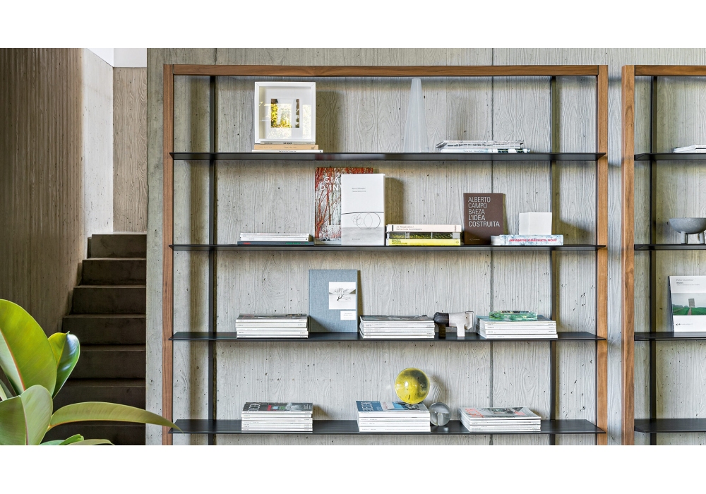 Alix conçue par Maurizio et Silvia Varsi pour Bonaldo est une bibliothèque avec structure et étagères en métal peint mat en différentes finitions, structure en bois plaqué noyer canaletto ou frêne anthracite. Disponible en 2 modèles.