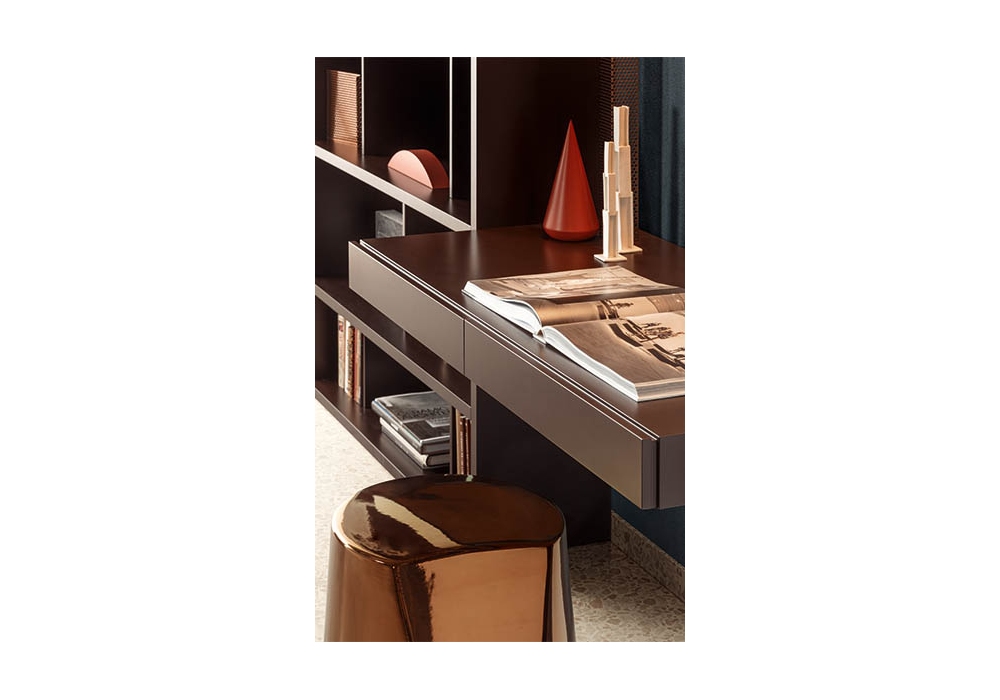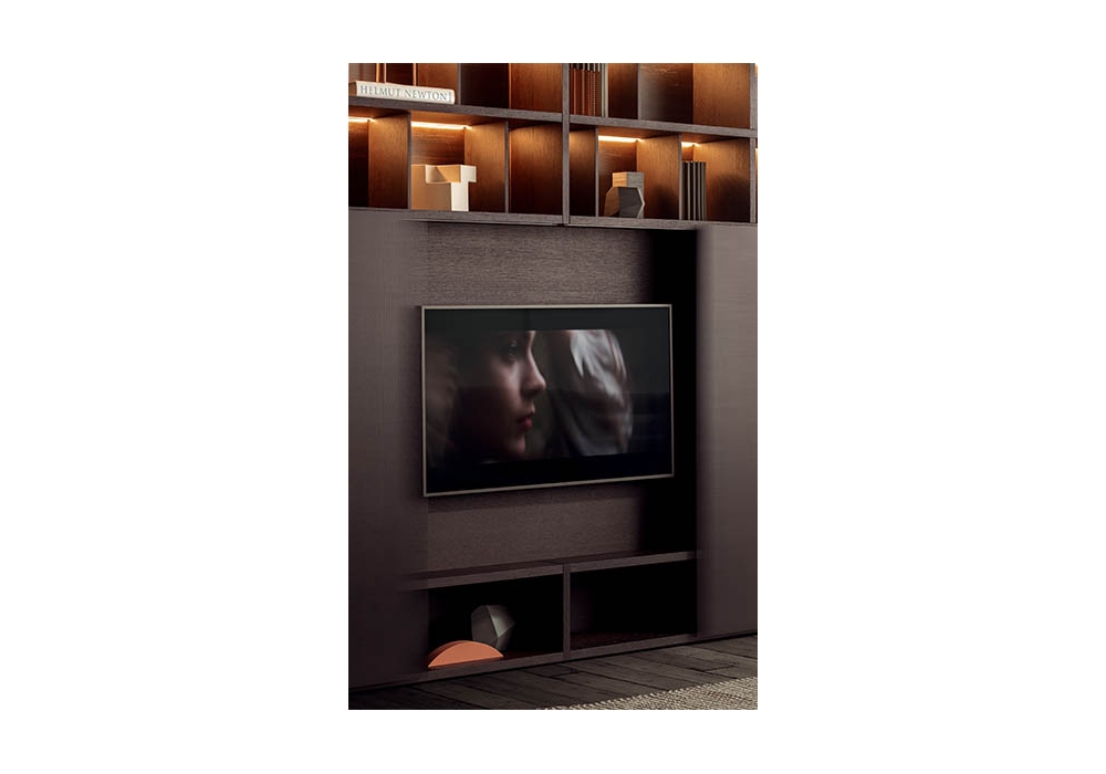 Spazioteca conçu par Pianca est un système de salon de vie polyvalent, avec la capacité d'accueillir des objets, des livres, des écrans de télévision, de diviser les pièces de la maison et d'intégrer des solutions de bureau à domicile. Côtés, étagères, fonds et cloisons de 1 cm d'épaisseur en standard, et compartiments exempts de trous et de quincaillerie.