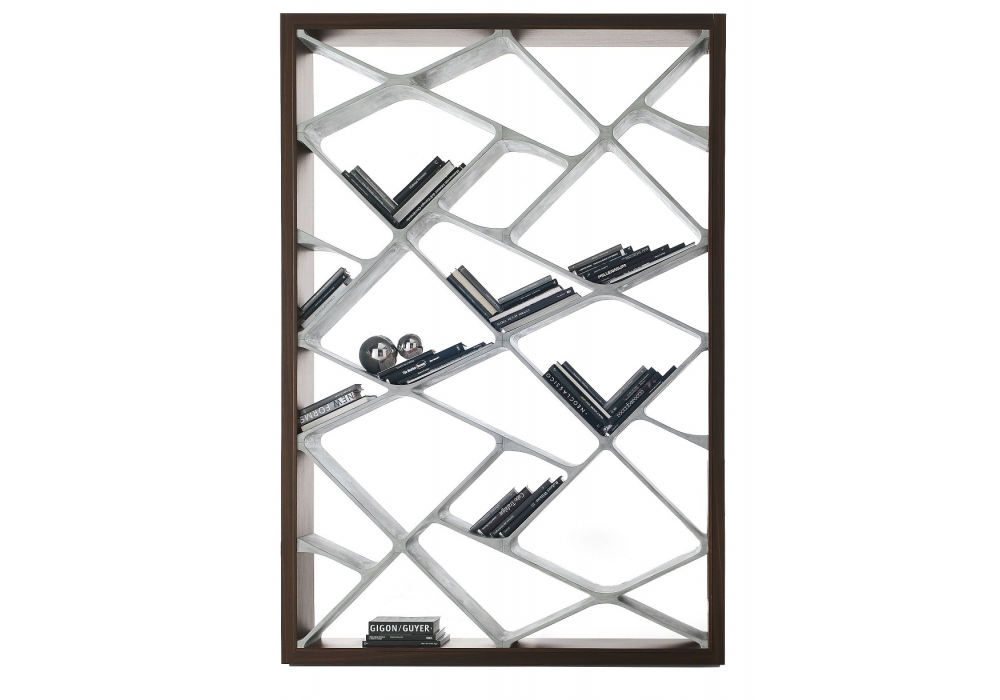 Shanghai conçue par Giuseppe Bavuso pour Alivar est une bibliothèque réalisée avec structure externe en chêne traité thermiquement ou teinté noir ou en MDF laqué. Structure interne en Baydur structurel expansé obtenu au moyen d'un moule en acier, recouvert de béton spatulé gris ou laqué mat.