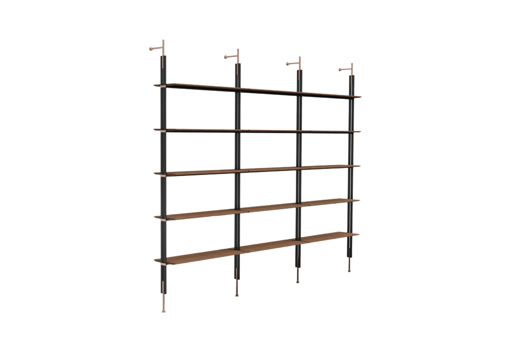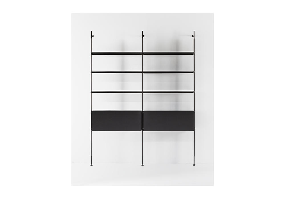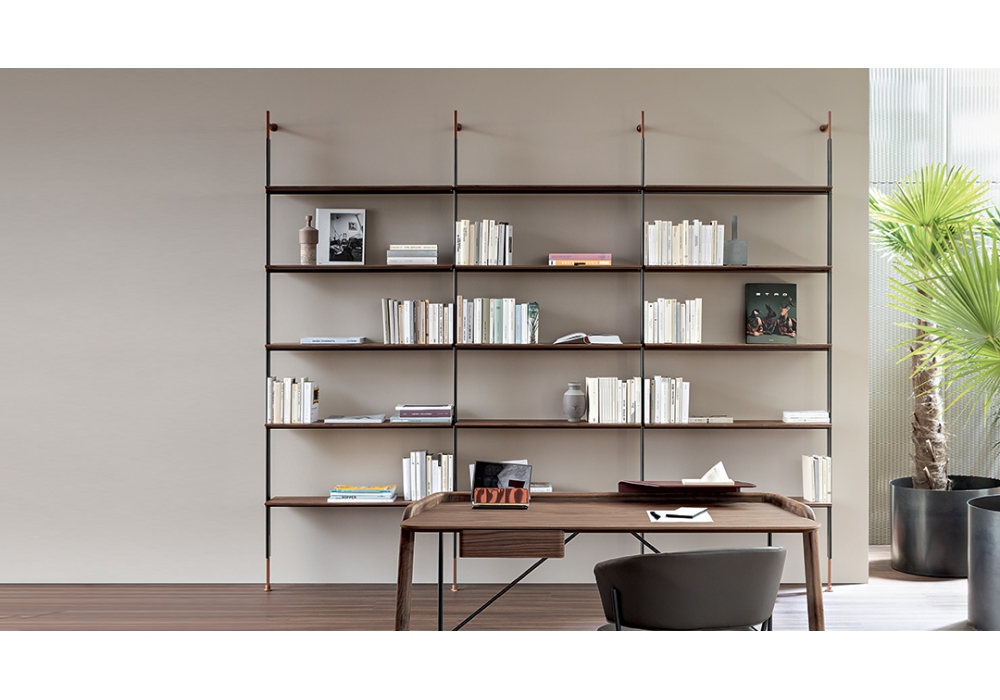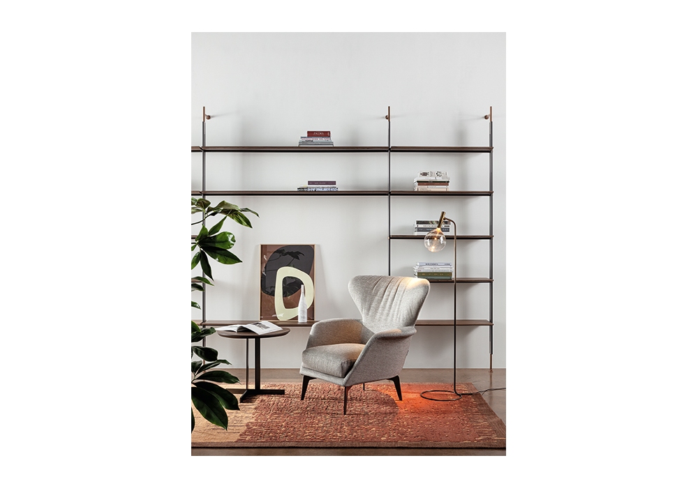 Roll conçue par Dondoli & Pocci pour Bonaldo est une bibliothèque avec fixation au mur ou au plafond, avec étagères en bois laqué plomb mat ou plaqué noyer canaletto. Le montant est en métal peint au plomb, avec des détails en différentes finitions. Disponible dans de nombreuses compositions.