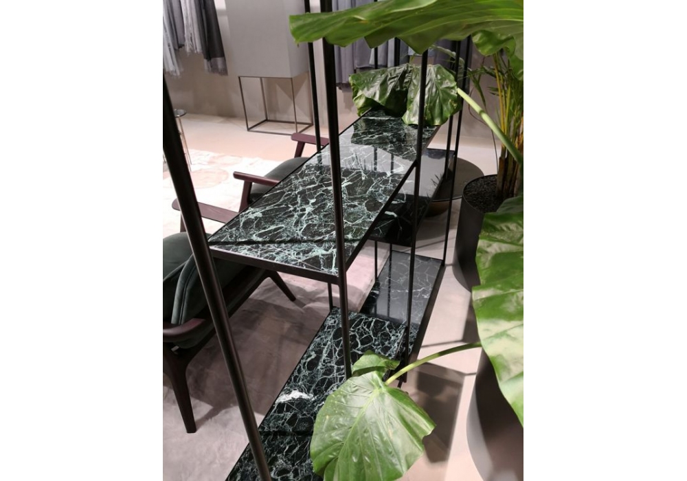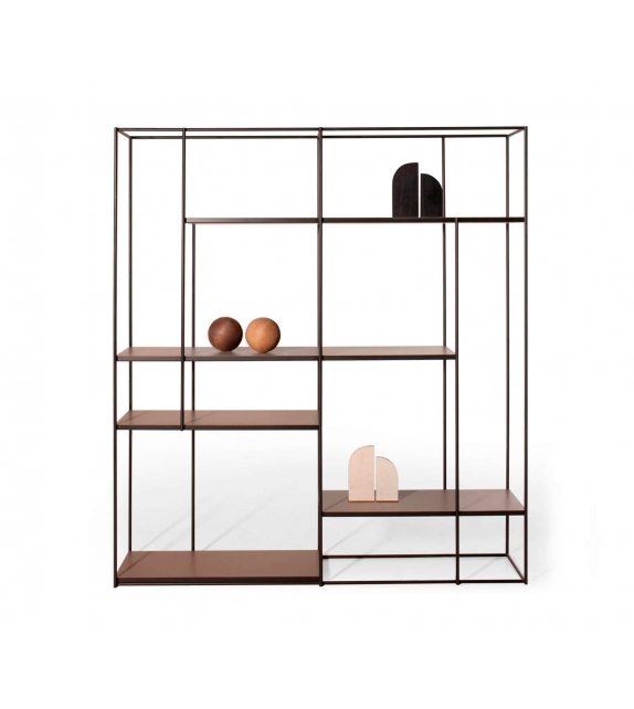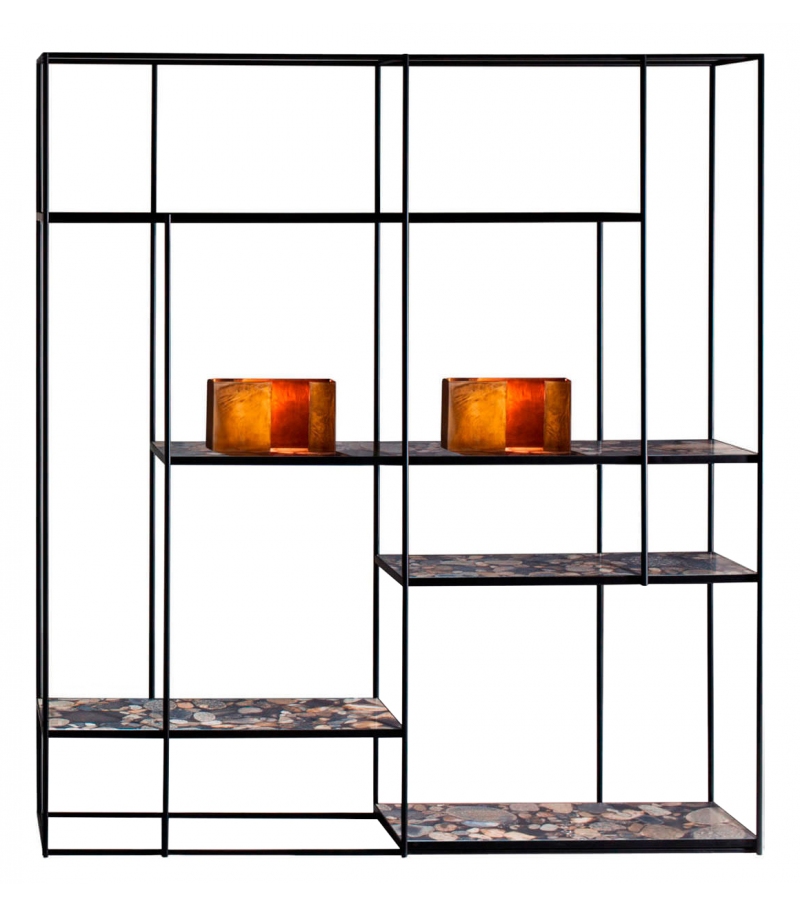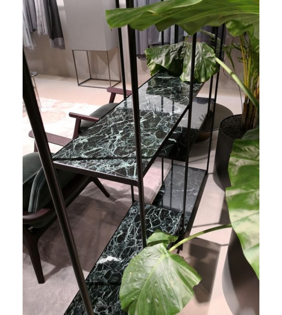 Hill conçue par Studiopepe pour Ivano Redaelli est une bibliothèque avec structure de support quadrangulaire en métal peint en noir mat. Les étagères sont en métal avec la possibilité d'insérer des plateaux en marqueterie de noyer Canaletto, de cuir pleine fleur ou de marbre. Hill est disponible en différents modèles.