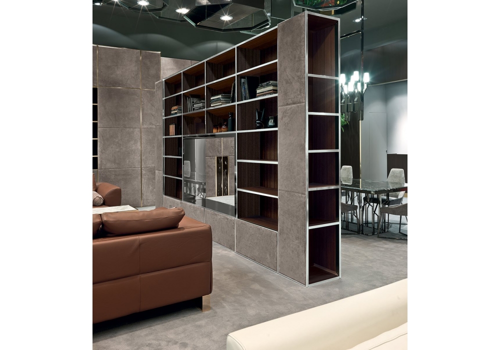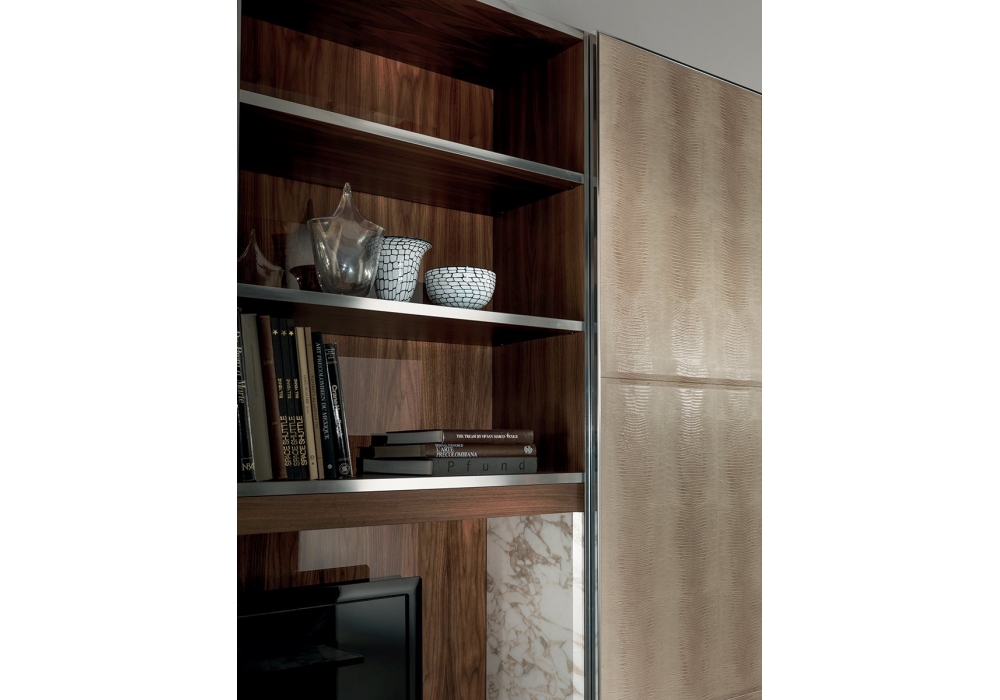 Ianus Middle conçu par Alessandro La Spada est un paroi aménagée modulaire avec structure en bois plaqué, bords et profils en aluminium anodisé et étagères en essence de bois, recouverts de cuir ou de verre. Les façades des tiroirs sont recouvertes de cuir. Le système dispose d'un module spécial personnalisable de 180 cm pour la télévision.