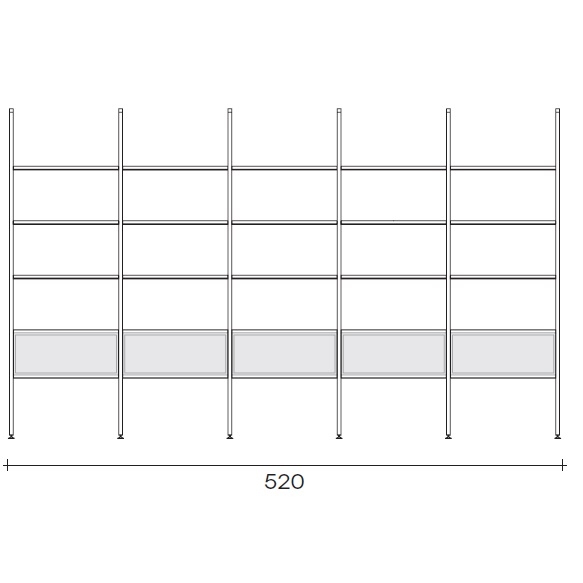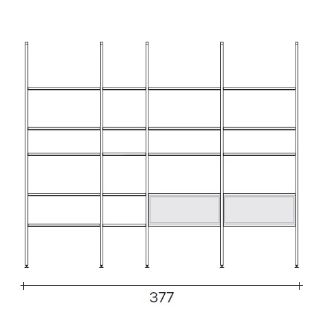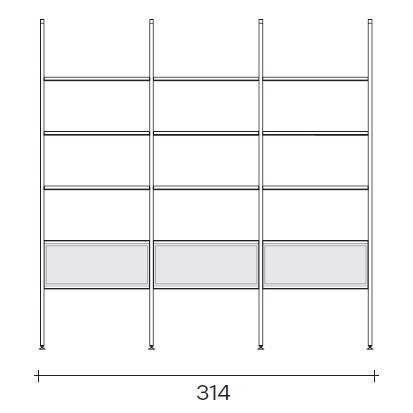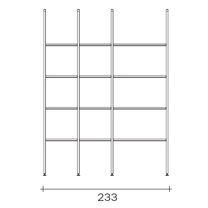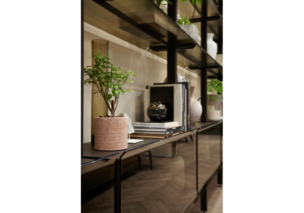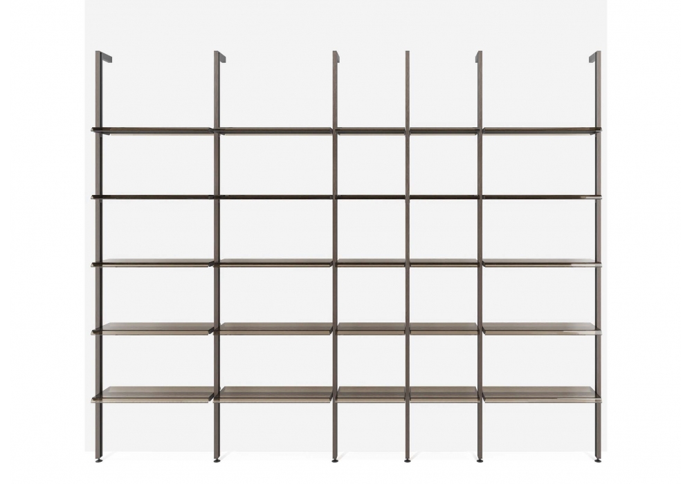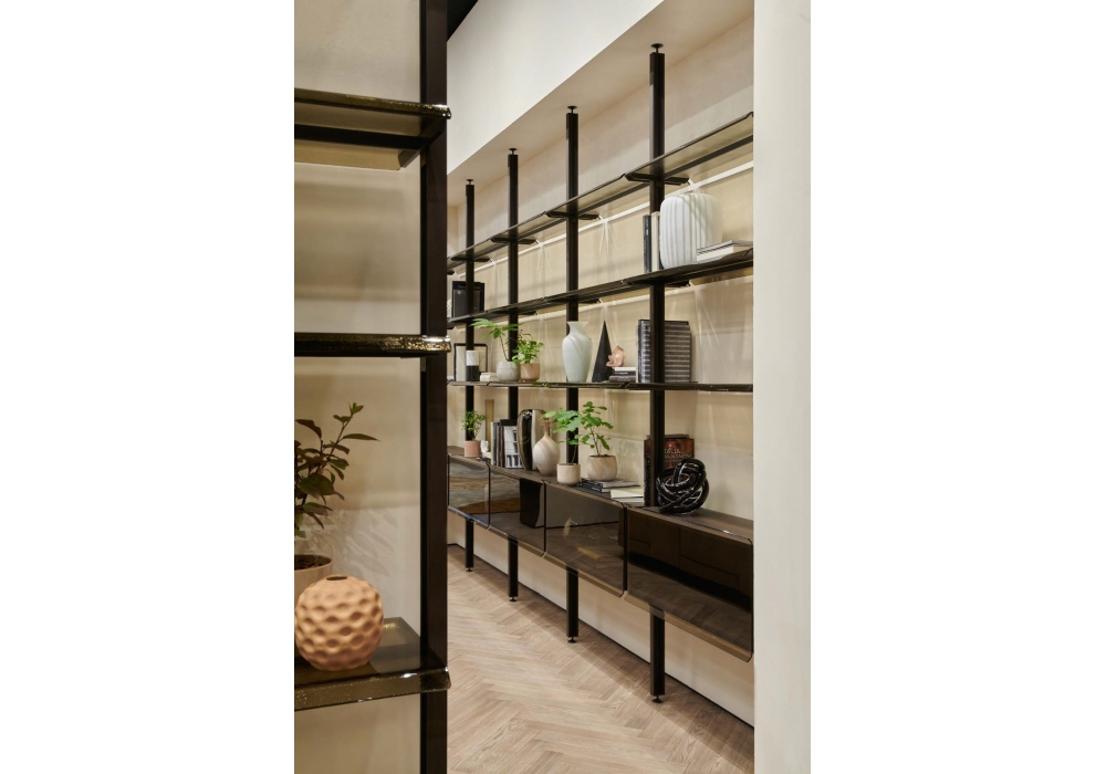 Remind conçue par Simone Bonanni pour Fiam est une étagère murale en aluminium, verre et bois, disponible dans la version avec fixation au plafond ou avec fixation murale. Structure composée de montants verticaux et de traverses en aluminium anodisé noir. Les montants comportent une moulure en bois massif. Étagères en extralight, verre fumé ou bronze fusionné. Éléments conteneurs avec structure en mélaminé finition bois et portes abattantes en verre bombé extralight, fumé ou bronze.