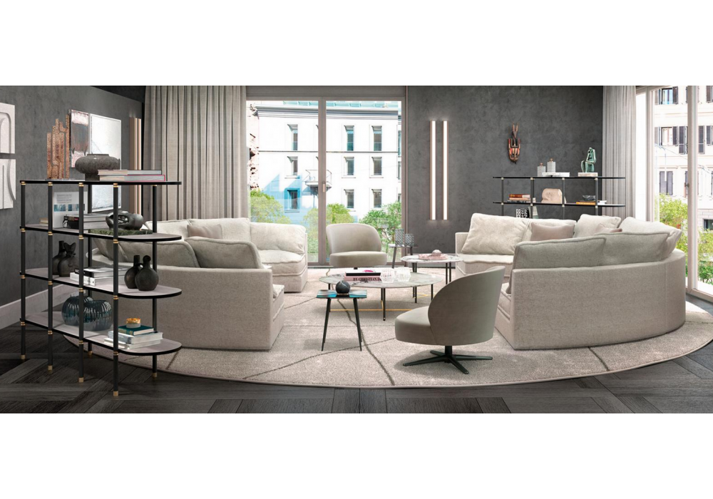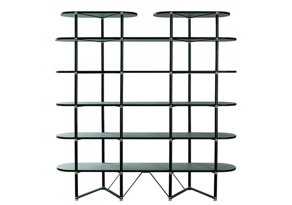 Boomerang conçue par Pietro Russo pour Casamilano est une bibliothèque avec structure composée de petits tubes en métal peint en noir superposés et espacés par des gobelets en laiton. Les étagères sont réalisées avec des panneaux de particules recouverts d'essence ou laqués.