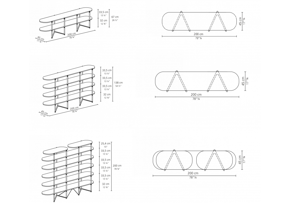 | Dimensions | 200 x 45 x H 67 cm; 200 x 45 x H 138 cm; 200 x 45 x H 200 cm. |