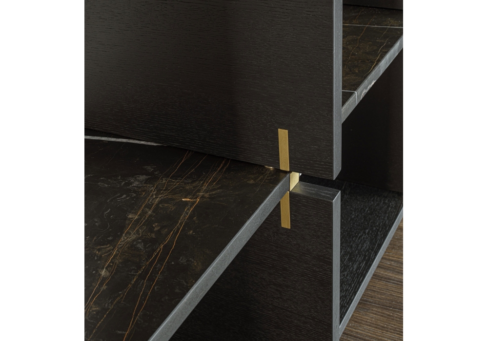 Card conçue par Michael Anastassiades pour Molteni&C est une bibliothèque composée de côtés, base et plateaux en essence de chêne noir, plateau en marbre caissonné avec insert en céramique en marbre Sahara noir, inserts en laiton peint et socle de sol en métal avec peinture époxy. Disponible en différents modèles. Aucune réduction d'aucune sorte ni modification des types et des finitions n'est possible.