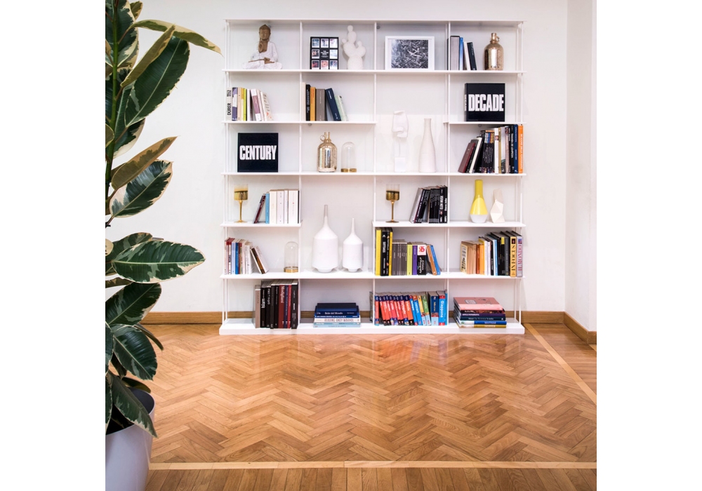 Krossing Maxi conçu par Kriptonite est un système mural qui place le poids sur le sol. Il peut être considéré comme une évolution du système Krossing car grâce à sa plus grande profondeur (25 cm) il accueille de gros volumes et magazines. Disponible en aluminium anodisé ou blanc. En plus des dimensions et finitions standards, il est possible de demander des dimensions et des couleurs spéciales.