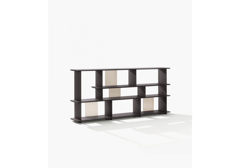 Tess conçue par Jean-Marie Massaud pour Poliform est une bibliothèque avec structure en panneaux de fibres de moyenne densité plaqués orme noir et panneaux arrière coulissants en verre fumé rayé ou bronze. Coffrets optionnels coloris cuir.