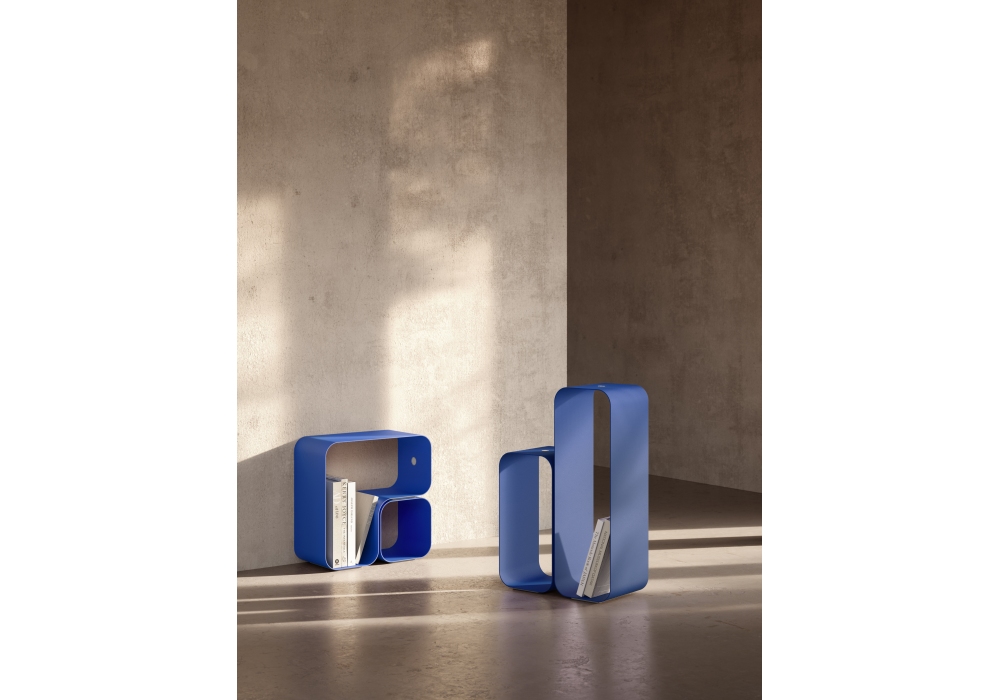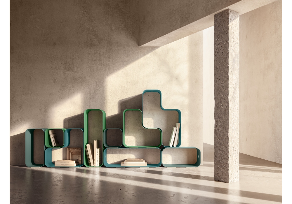 Rebus conçue par Francesco Rota pour Desalto est une bibliothèque modulaire composée d'ensembles combinés entre eux, réalisée en métal plié peint de 3 mm d'épaisseur. Assemblage par assemblage magnétique. Disponible en différents modèles et finitions.