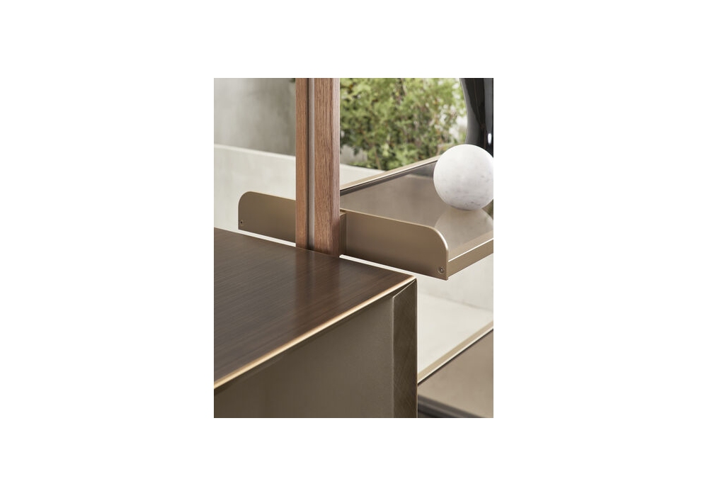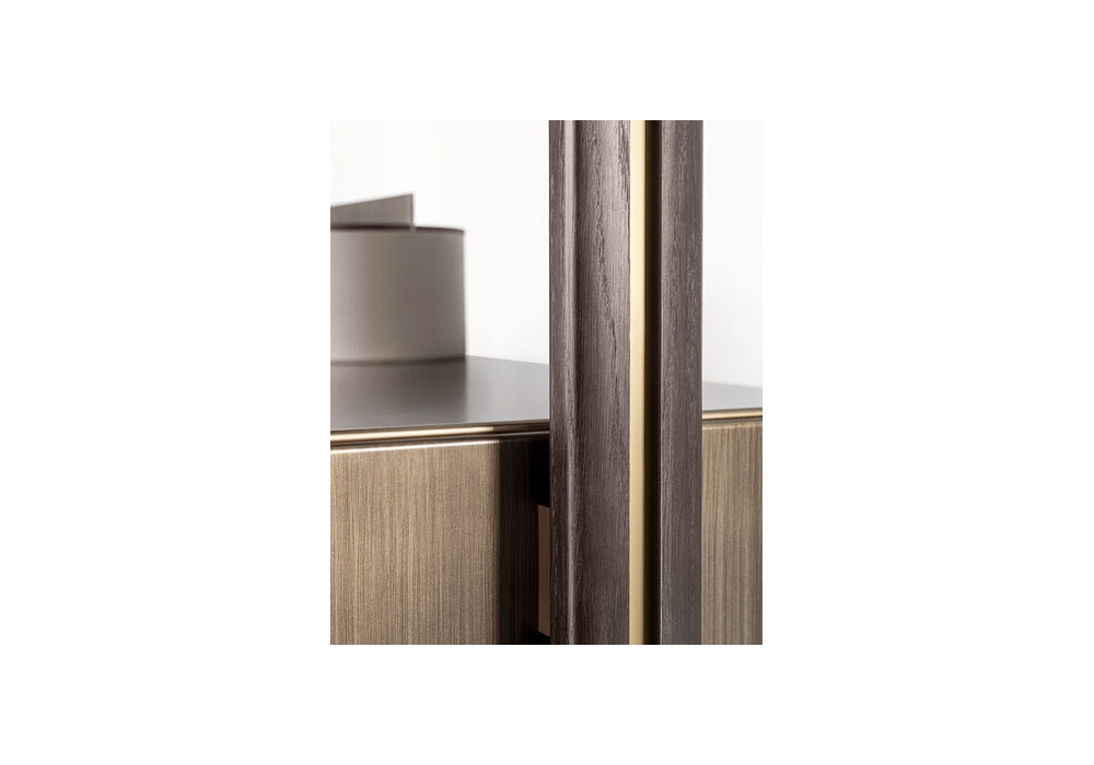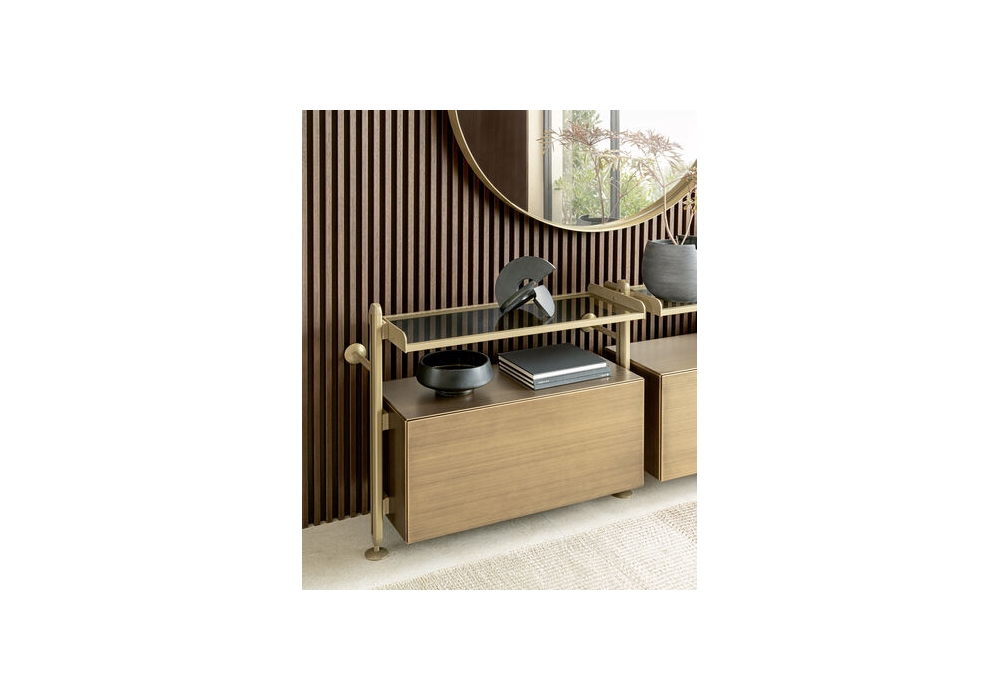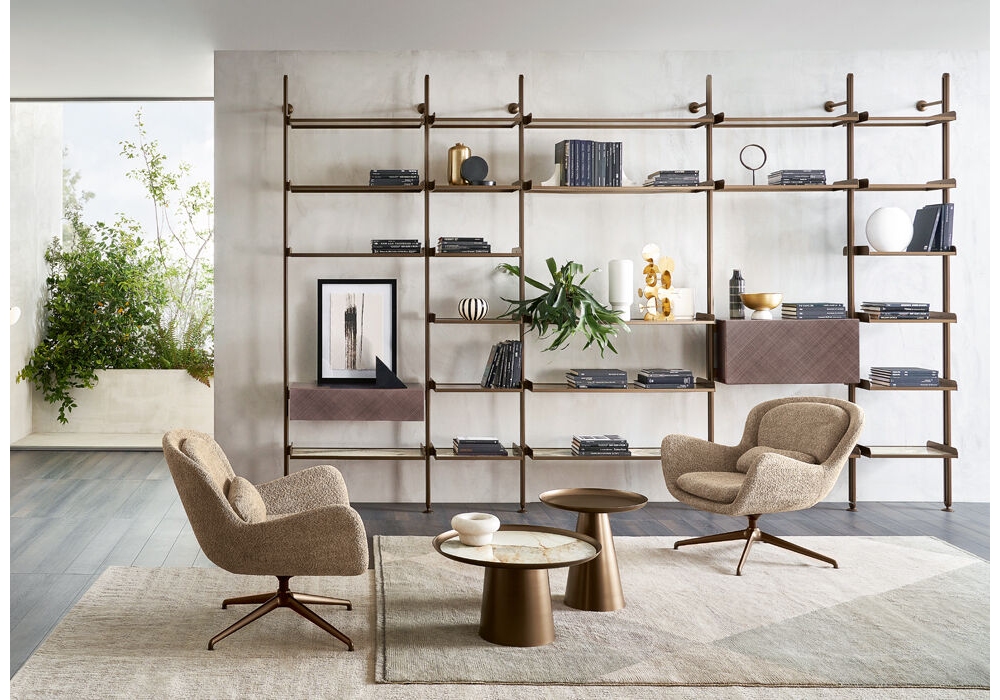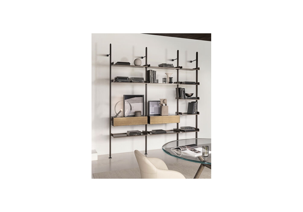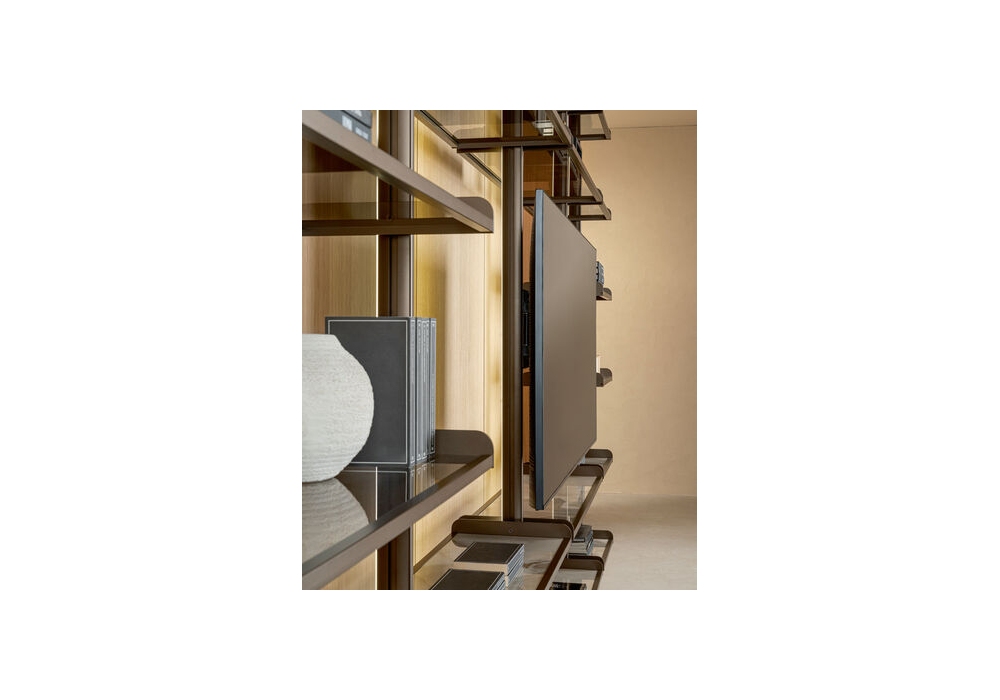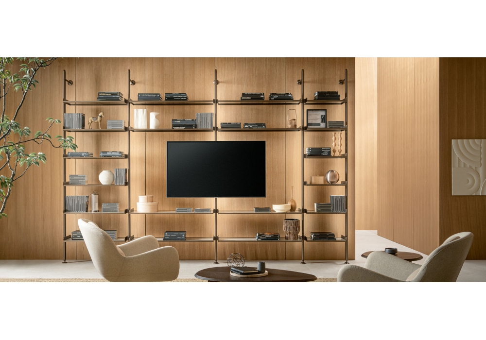 Techwall conçue par Riflessi est une bibliothèque multifonctionnelle au design essentiel et sophistiqué, conçue pour meubler, diviser et valoriser les espaces sans les fermer. Modulaire, personnalisable et infiniment reconfigurable, elle associe une structure légère et raffinée en aluminium à des étagères en verre ou en céramique et des rangements en bois laqué. Installable au mur ou au plafond, elle s'adapte parfaitement à tout type d'environnement, même avec des solutions personnalisées. Le bras support TV réglable et l'éclairage LED intégré sont disponibles en option.