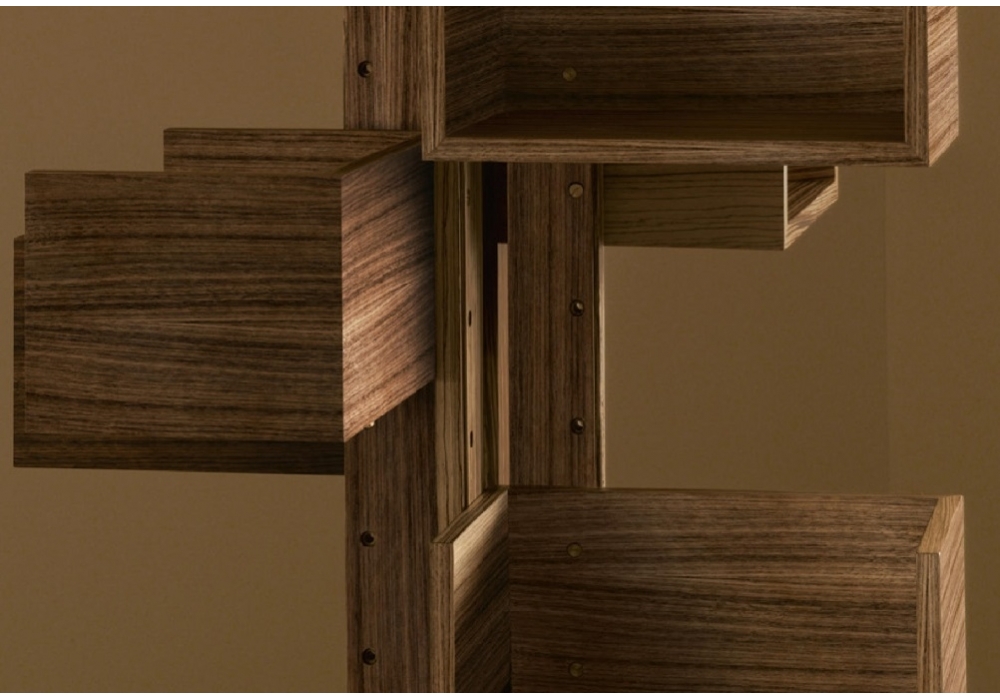 Albero by Poltrona Frau est une bibliotheque. Structure portante en noyer Canaletto massif (29) avec montage à encastrement sur crémaillère, étagères en fibre de bois de moyenne densité plaqué essence. Embouts, au plafond et au sol, en fer laqué noir texturé avec effet structuré. Un « verre » enmétal positionné contre le plafond contient un pivot en acier avec des bagues enmétal réglables. Au sol, la prise du pivot est garantie par un caoutchouc antidérapant. Le système pivote à 360°. Le perçage tout au long desmontants verticaux permet de positionner librement de 8 à 12 étagères.