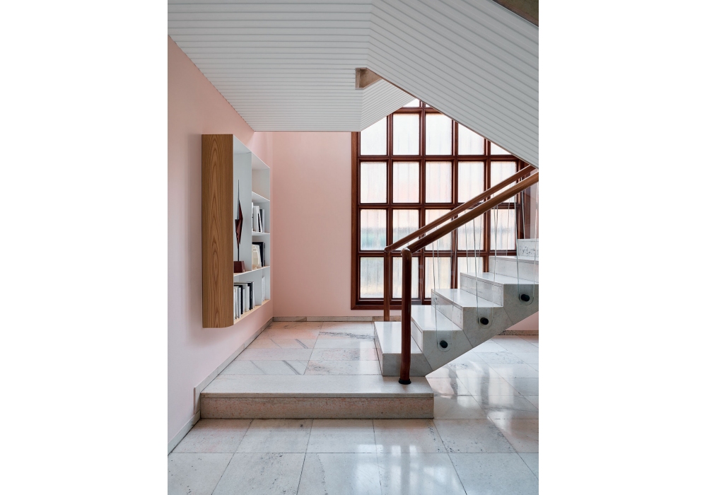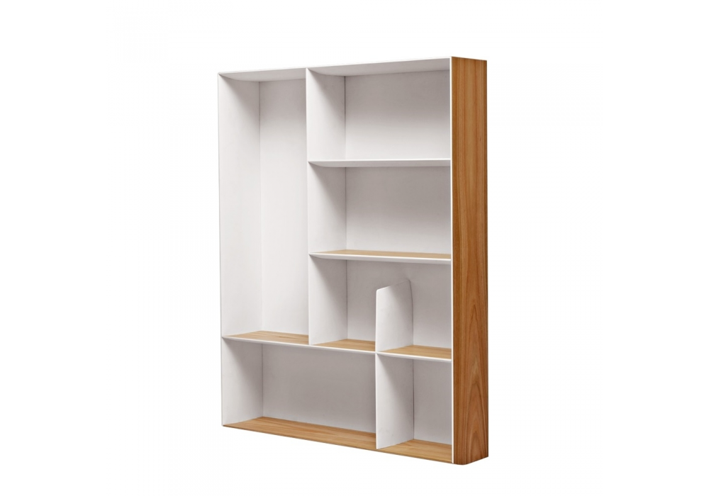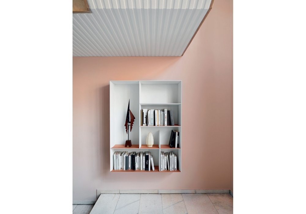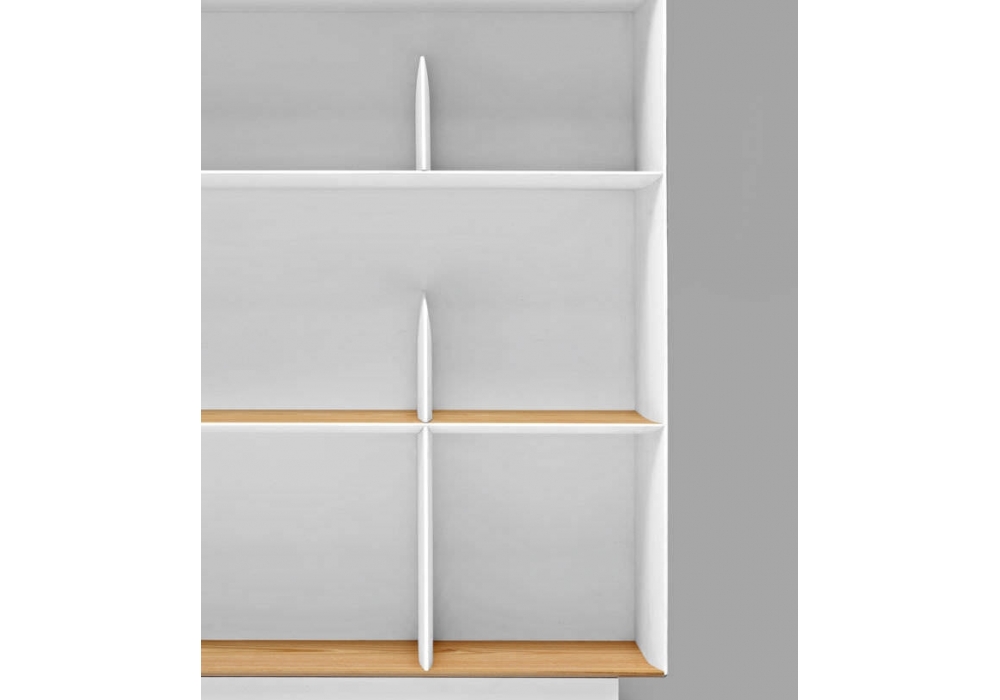 D.357.2 conçue par Gio Ponti pour Molteni&C est une bibliothèque en contreplaqué profilé avec revêtement en orme, en partie avec une finition transparente naturelle, en partie peinte à la main en blanc. Il est disponible dans la version avec ou sans miroir appliqué.
