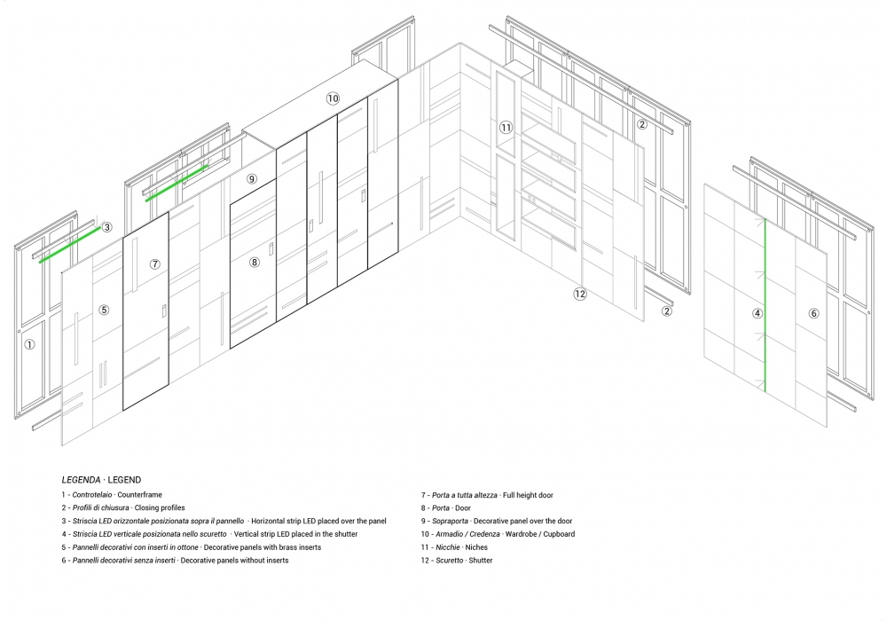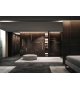 Agorà Boiserie conçu par Giuliano et Gabriele Cappelletti pour Emmemobili est un système modulaire de panneaux (55xH.270 cm) en contreplaqué plaqué. La décoration est créée en alternant le grain des dalles de bois avec la possibilité d'ajouter des inserts en laiton.