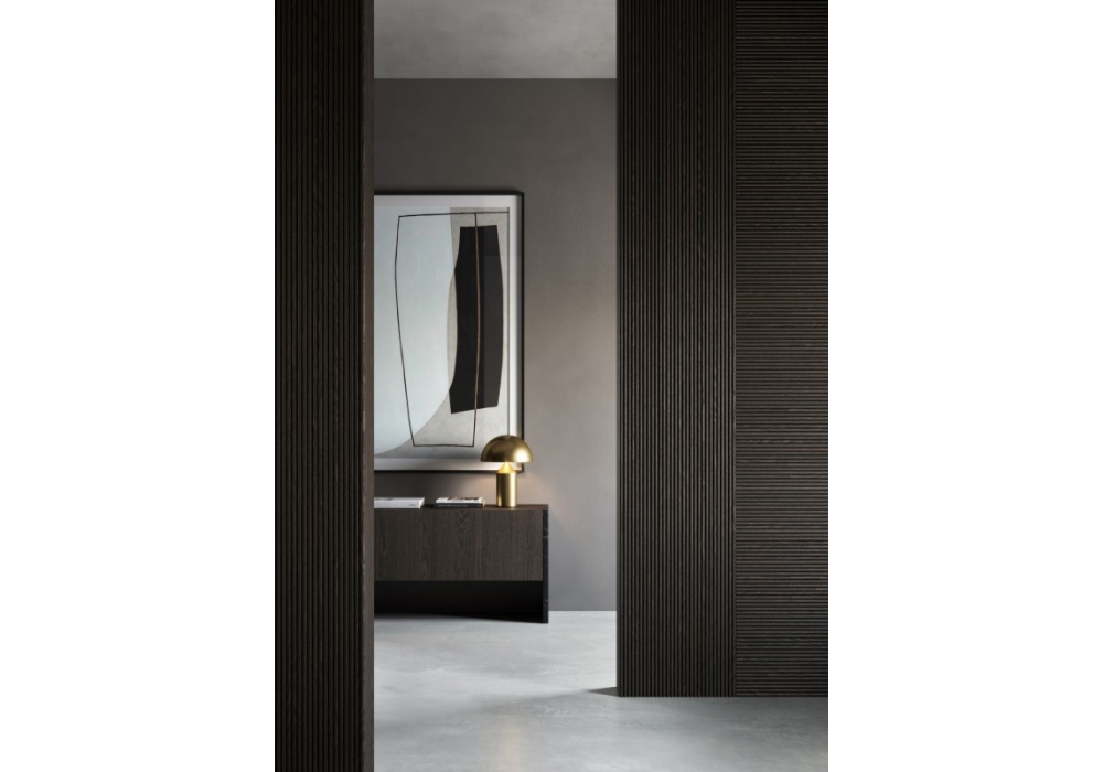 Uon Boiserie conçu par Elena Pancaldi pour Emmemobili est un système modulaire (60xH270 cm) composé de listes arrondies en bois massif, placées côte à côte et appliquées manuellement sur des panneaux plaqués. Possibilité d'utiliser le panneau verticalement ou horizontalement.