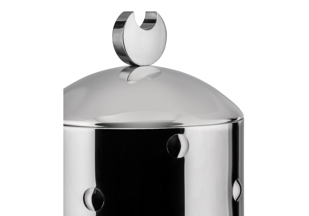 Kalistò 1 conçue par Clare Brass & CSA pour Alessi est une boîte de cuisine en acier inoxydable 18/10 avec bouton en aluminium.