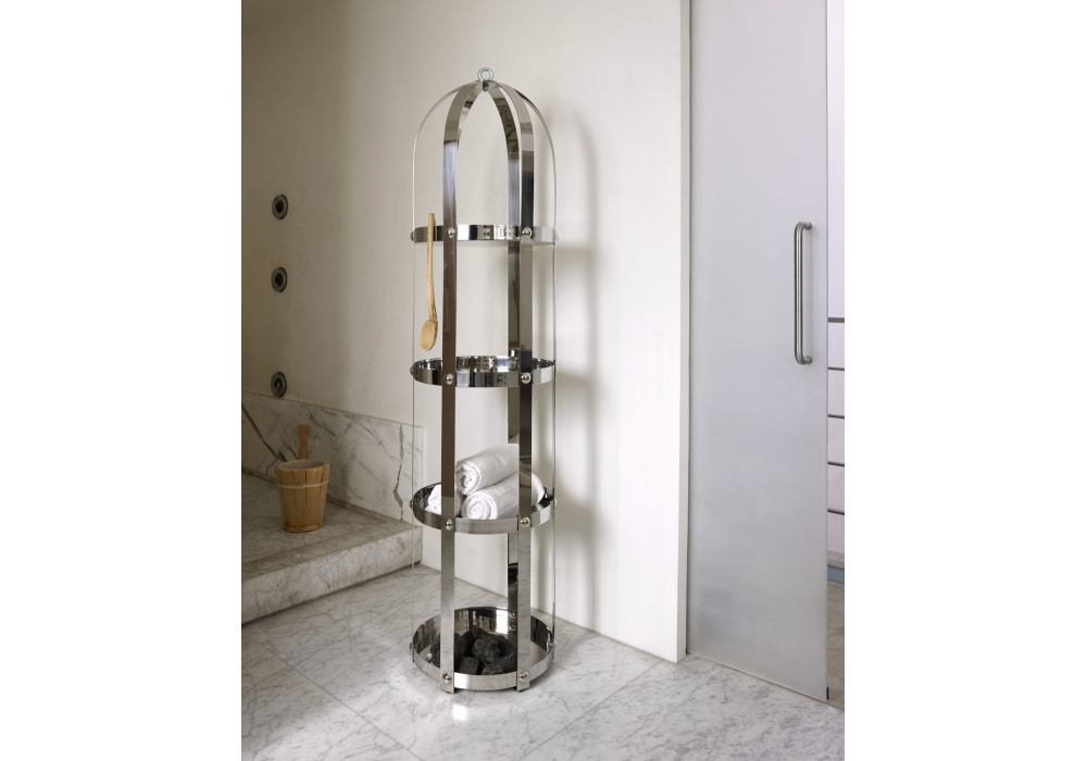 La Gabbia conçu par Lapo Ciatti pour Opinion Ciatti est un conteneur en acier avec quatre plateaux, décoré de 24 rivets polis. Disponible en différentes finitions.