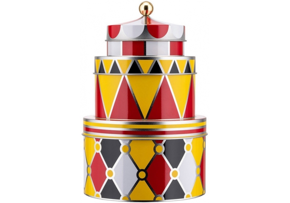 Circus conçu par Marcel Wanders pour Alessi est un set de trois boîtes porte-objets en fer blanc avec décoration.