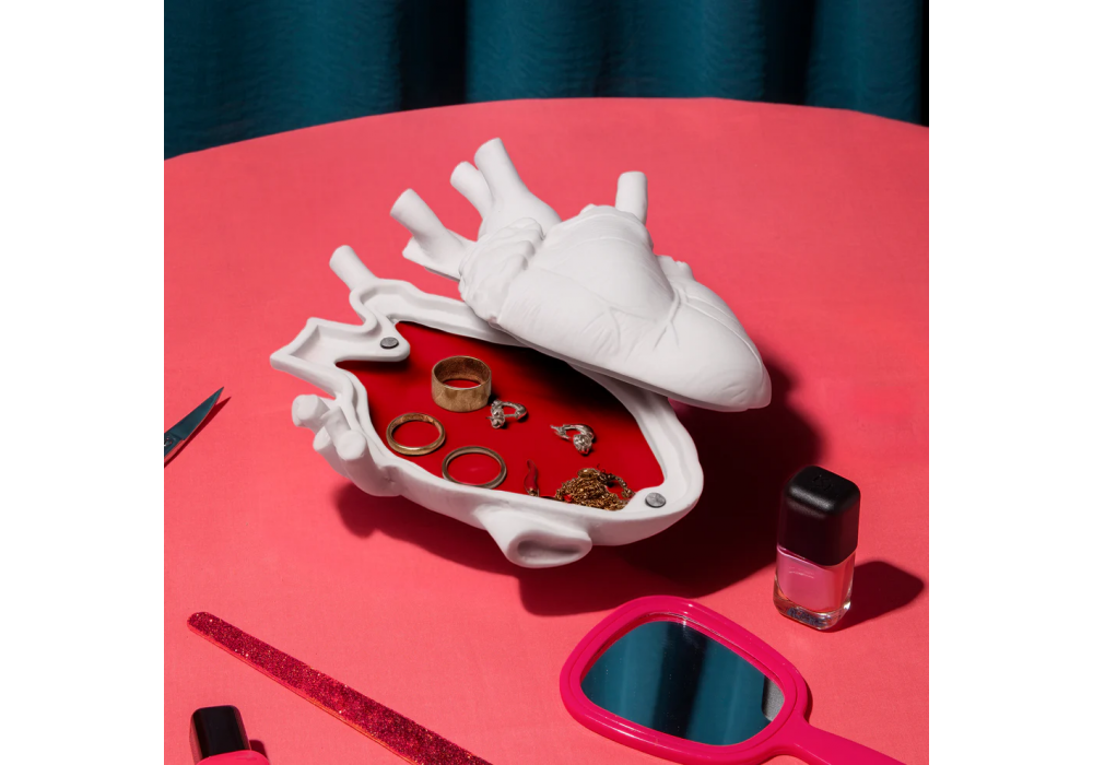 Love in Bloom conçue par Marcantonio pour Seletti est une boîte à bijoux en porcelaine blanche très fine qui représente l'anatomie d'un cœur humain.