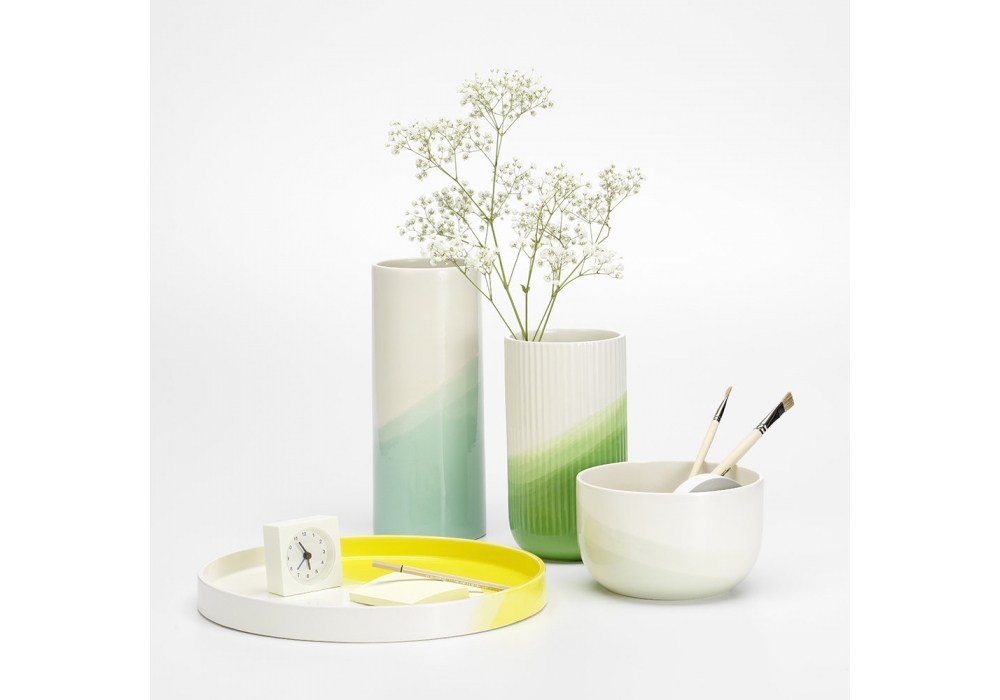 Herringbone Vessels conçu par Raw-Edges pour Vitra est une collection de bols, vases et plateaux en céramique émaillée teint à la main. Le bol est disponible en couleurs menthe et sable.