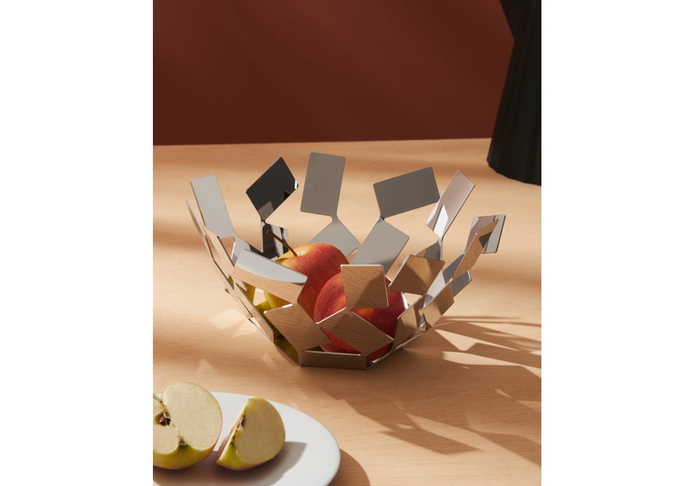 La Stanza dello Scirocco conçu par Mario Trimarchi pour Alessi est un porte-fruits en acier inoxydable, disponible en trois finitions : blanc, noir et inox.