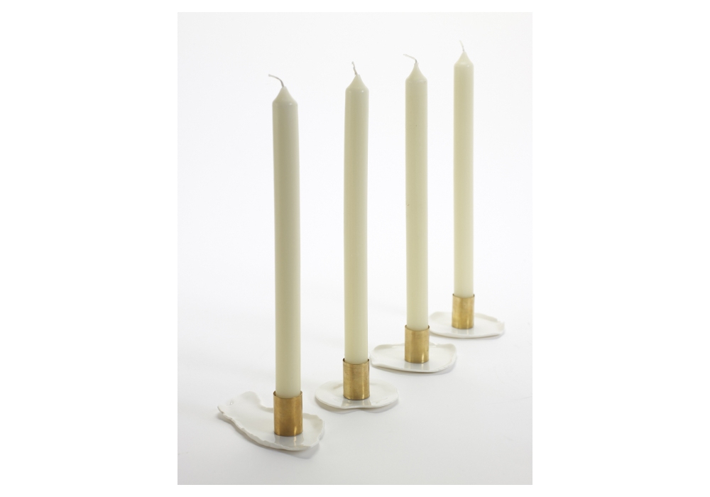 Marie conçu par Marie Michielssen pour Serax est un est un jeu de 4 bougeoirs structurés par une base de forme abstraite en céramique et un support pour bougies en cuivre.