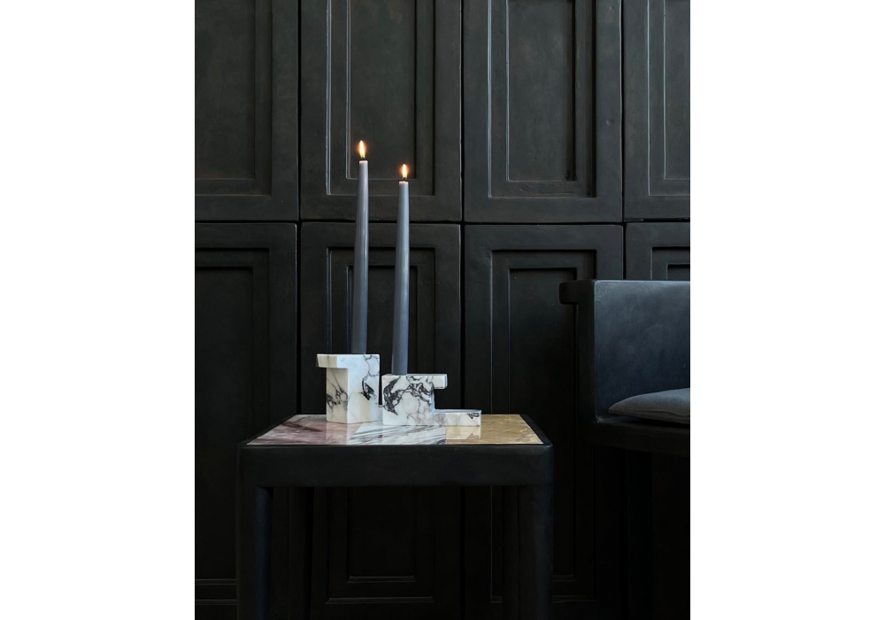 Brick conçu par Kristian Sofus Hansen & Tommy Hyldahl pour 101 Copenhagen est un bougeoir réalisé en marbre Calacatta. Disponible en différents modèles.