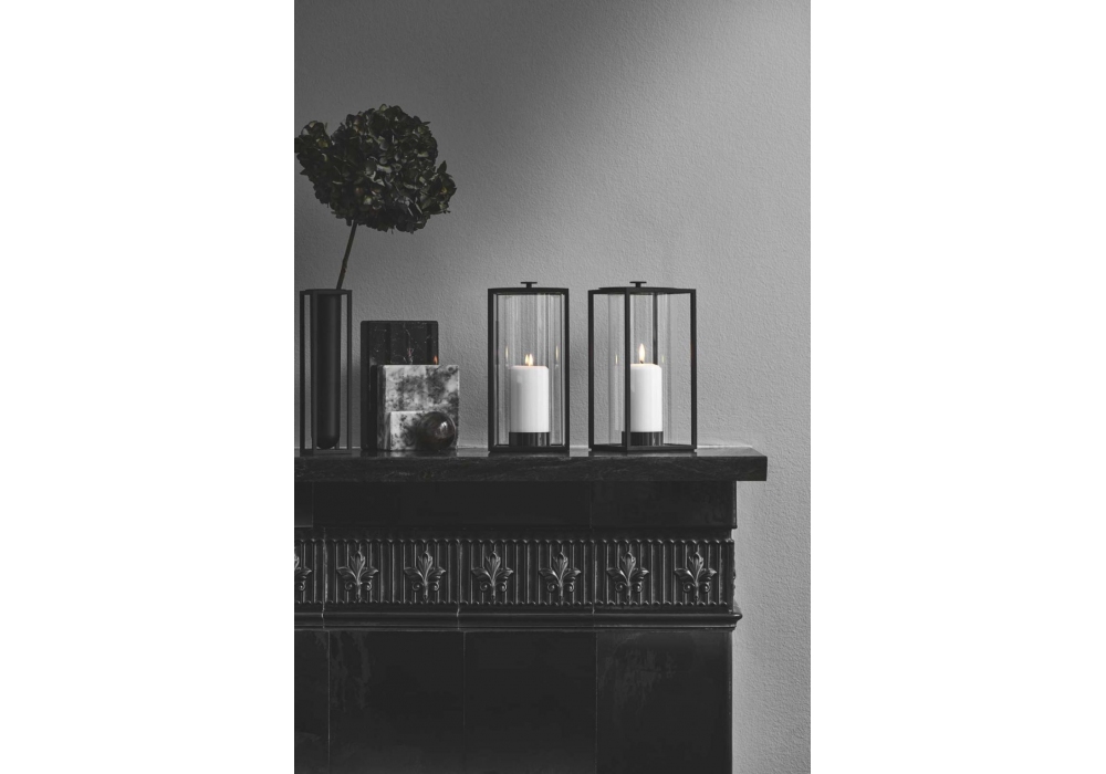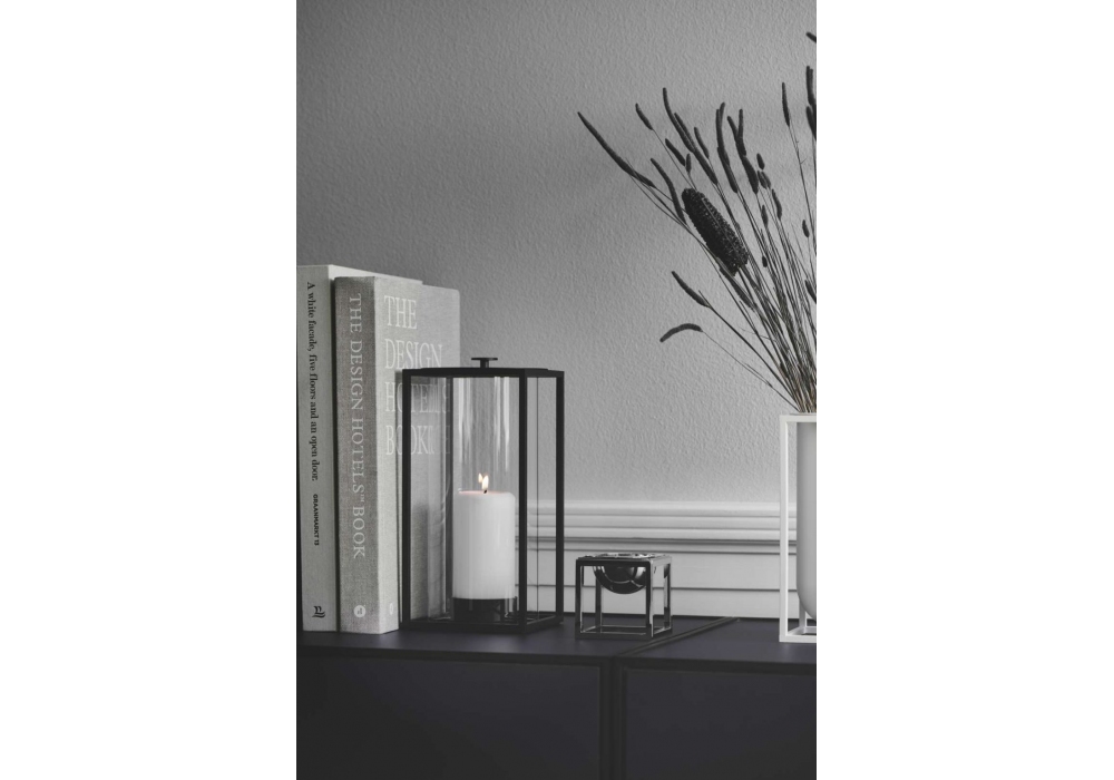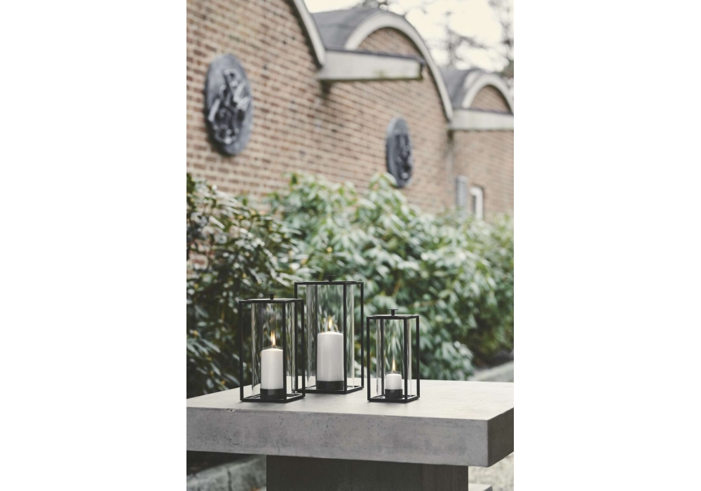 Light'In conçue par Søren Lassen pour Audo Copenhagen est une lanterne en métal peint en noir et verre transparent. lot de 4 pour la petite version. Disponible en différentes tailles.