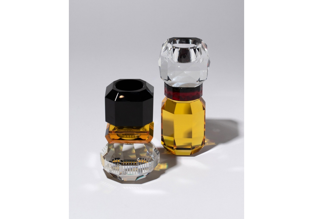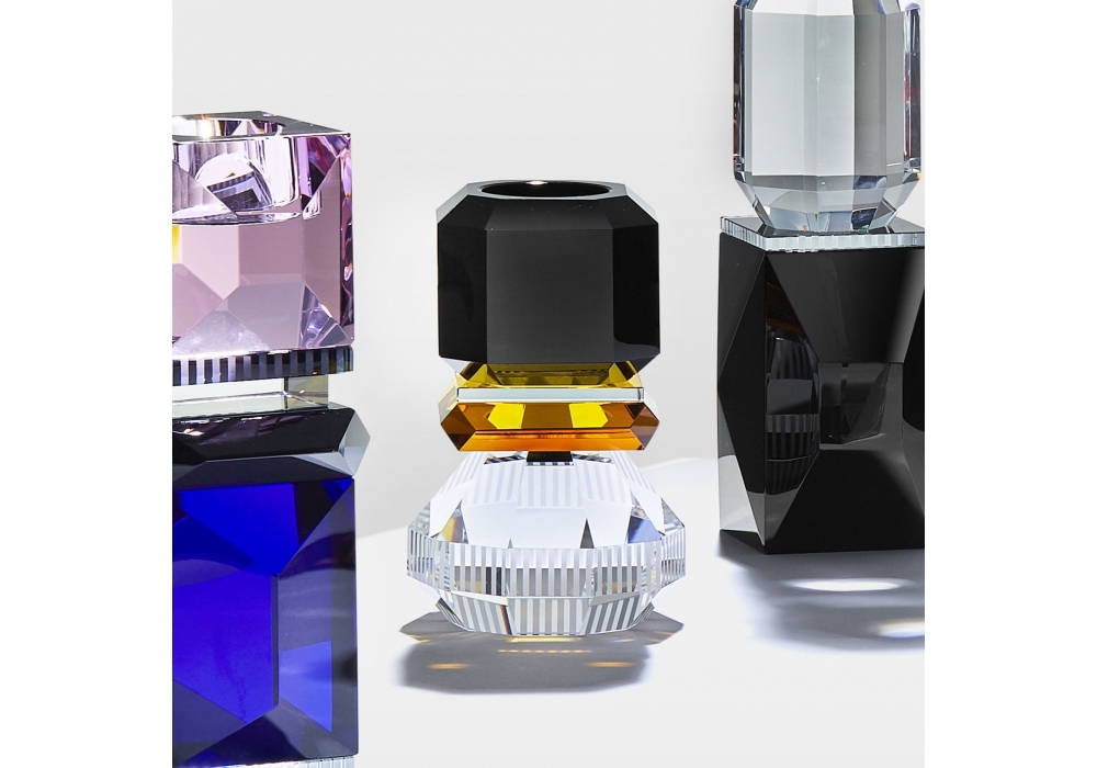 Phoenix produit et signé par Reflections Copenhagen est un bougeoir en cristal structuré par divers éléments géométriques sculptés et finis à la main en noir, ambre et transparent.