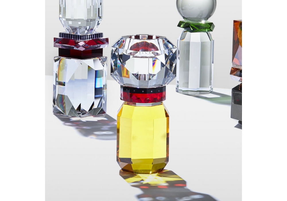 Nashville produit et conçu par Reflections Copenhagen est un bougeoir en cristal structuré par divers éléments géométriques sculptés et finis à la main en transparent, noir, rouge et jaune.