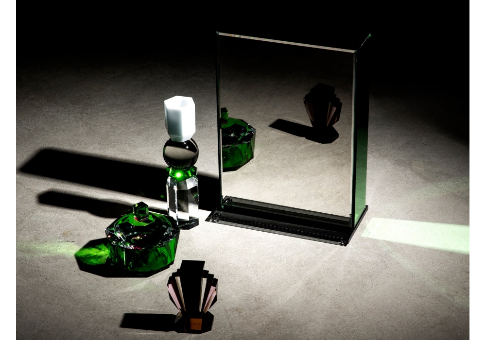 Queens produit et conçu par Reflections Copenhagen est un bougeoir en cristal structuré par divers éléments géométriques sculptés et finis à la main en noir, rose, marron et vert.