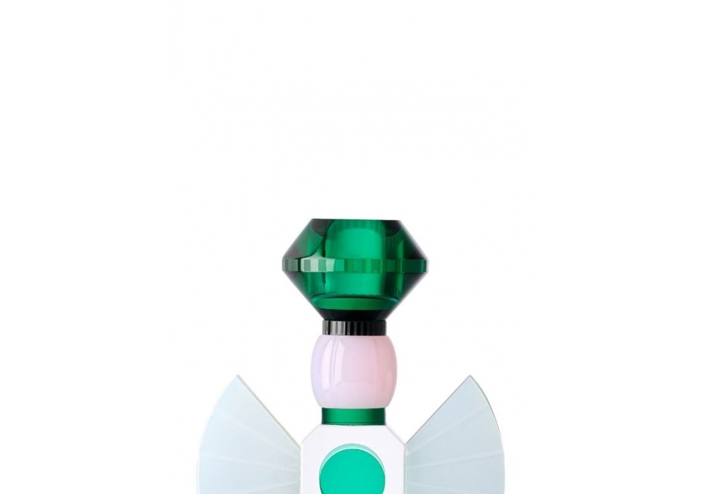 Carmina produit et conçu par Reflections Copenhagen est un bougeoir en cristal structuré par divers éléments géométriques sculptés et finis à la main en rose pâle, bleu clair, bordeaux, néon, jaune, orange et rose.