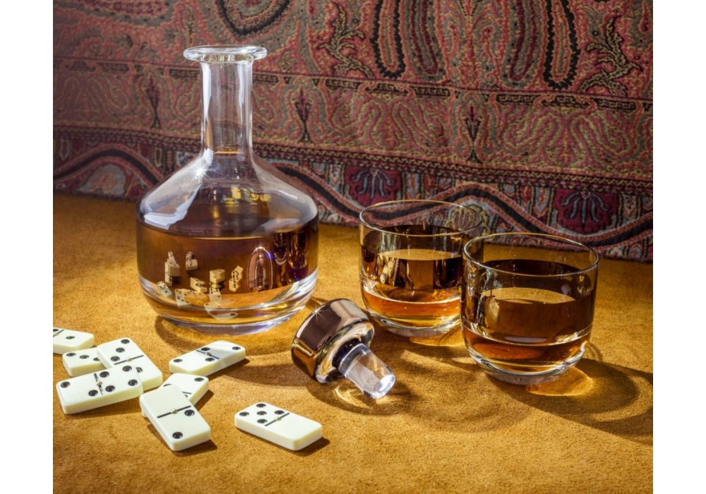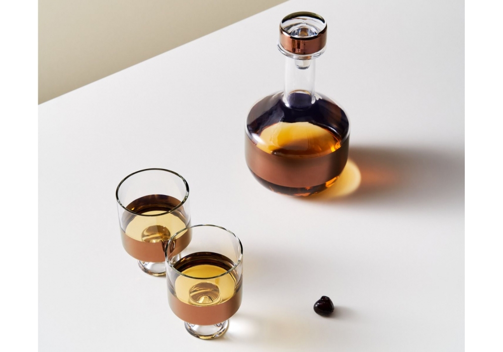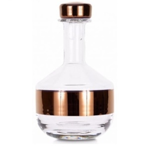 Tank Whiskey conçue par Tom Dixon est une carafe en verre soufflé transparent, détails disponibles en finitions cuivre ou noir.